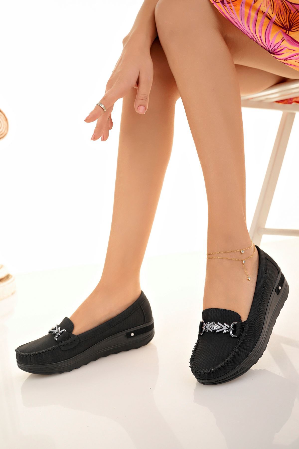 Dolgu Topuk Tokalı Siyah Kot Ayakkabı
