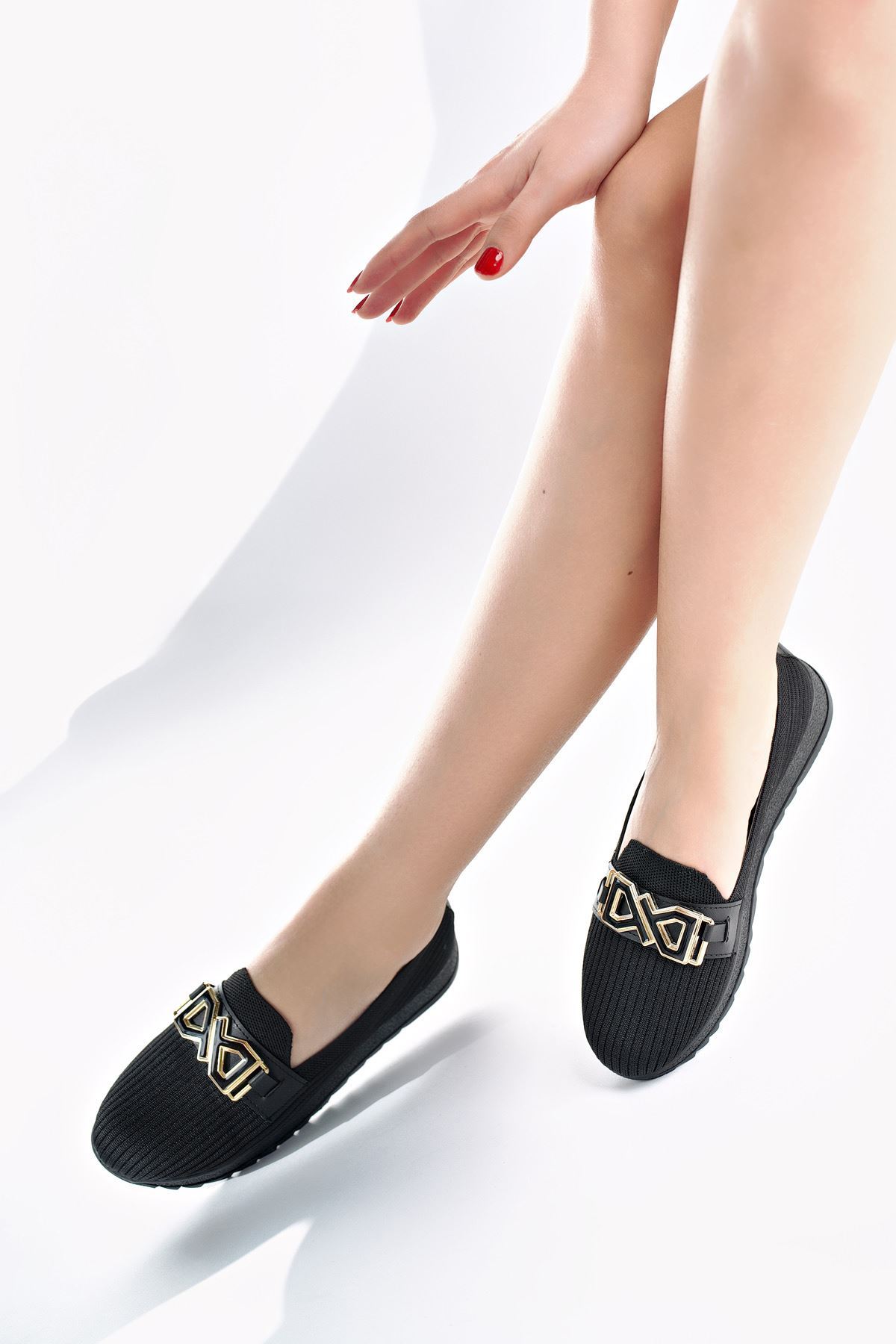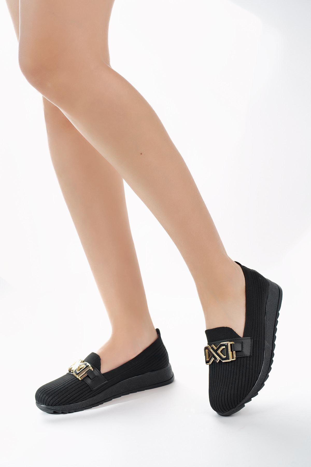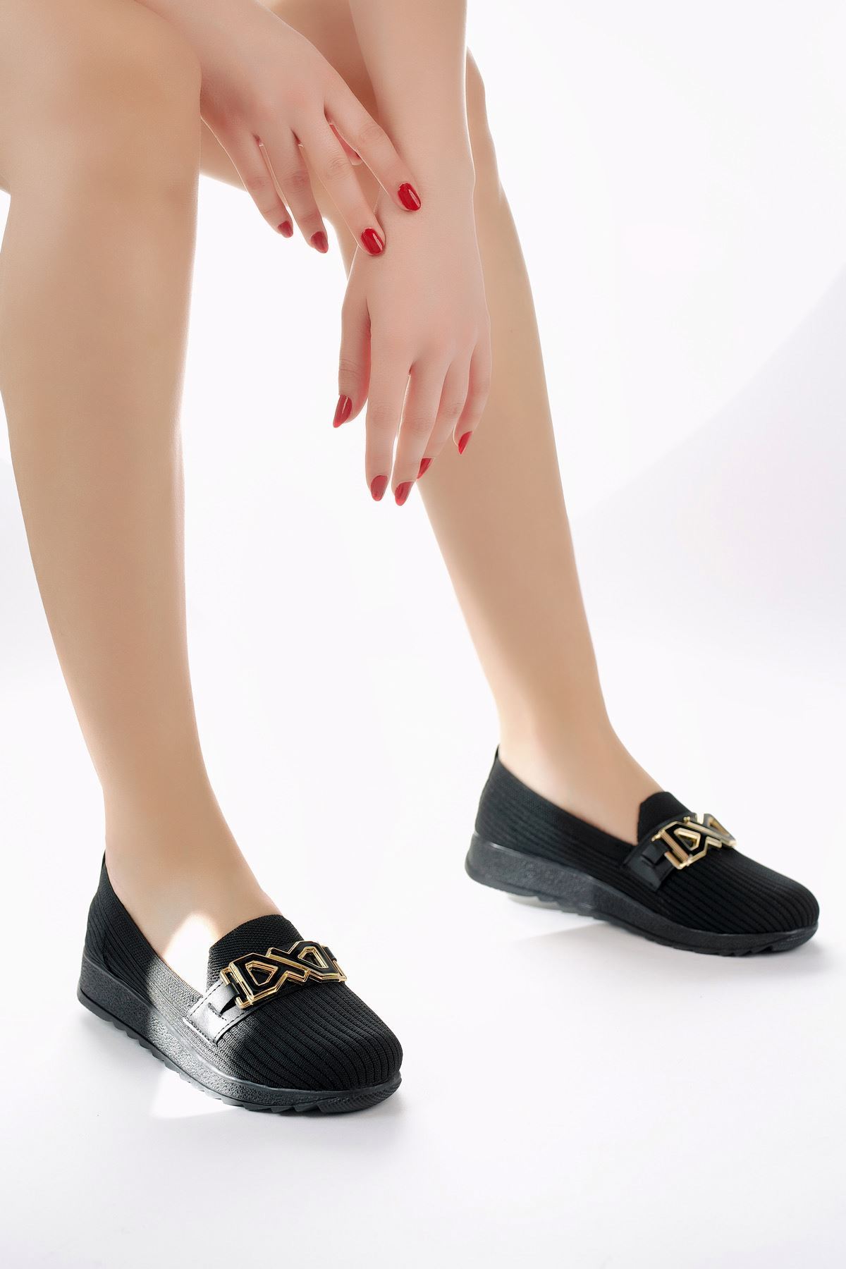 Dolgu Topuk Tokalı Siyah Triko Ayakkabı