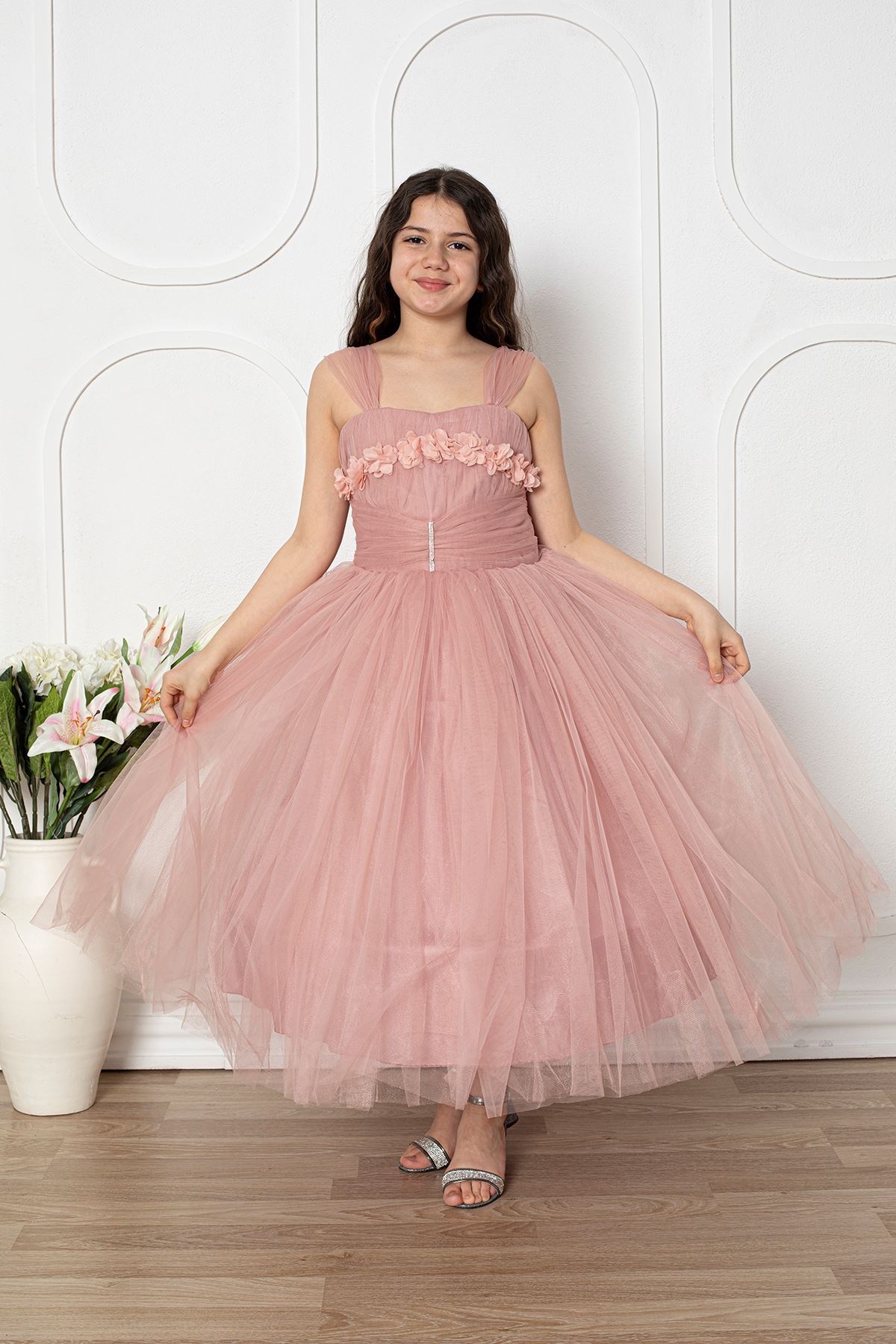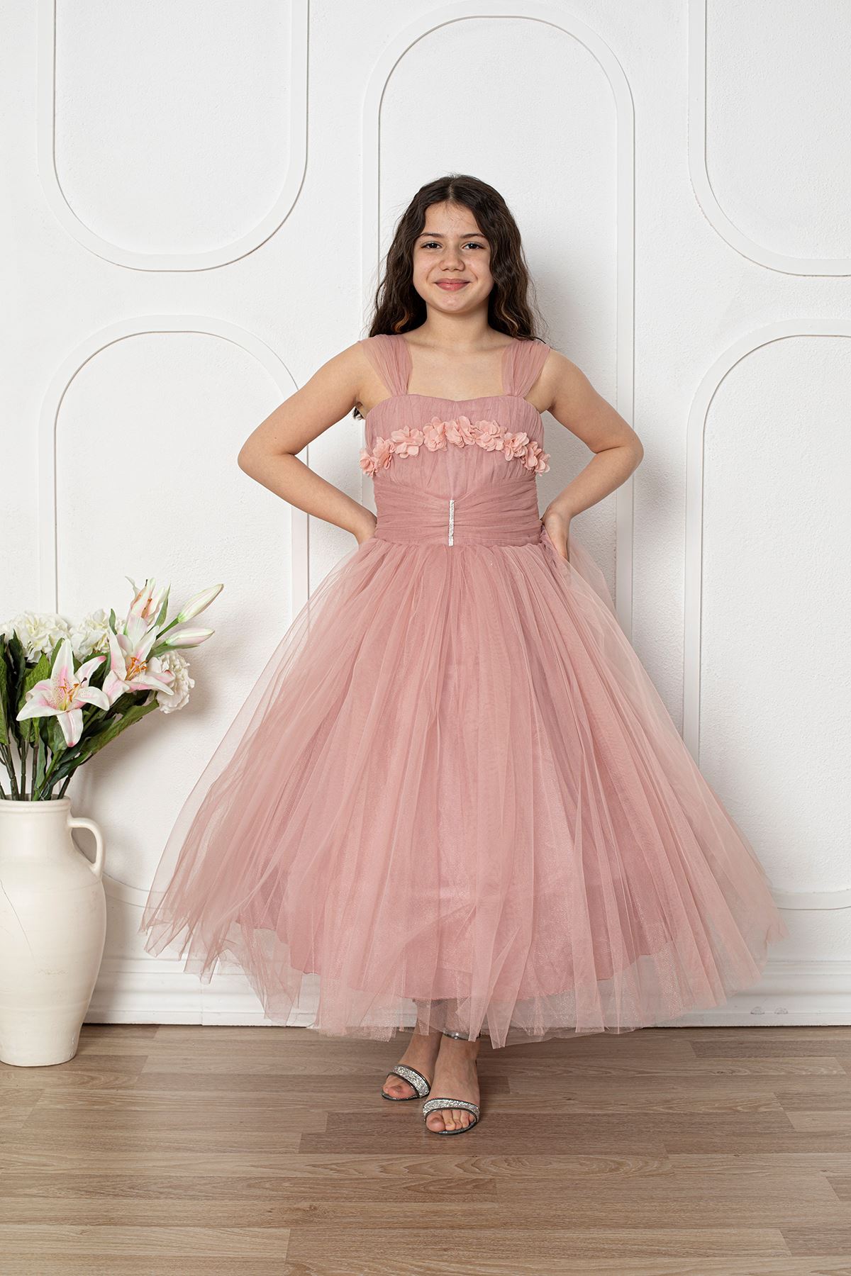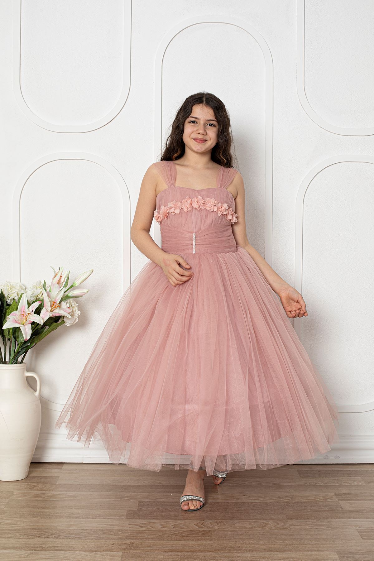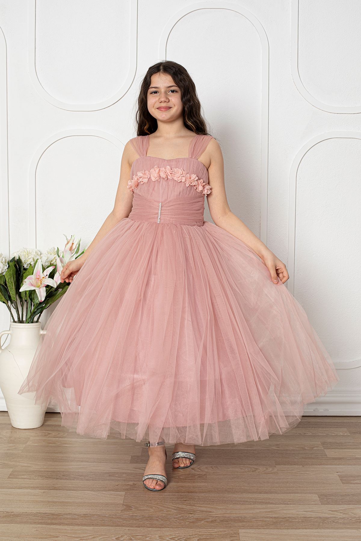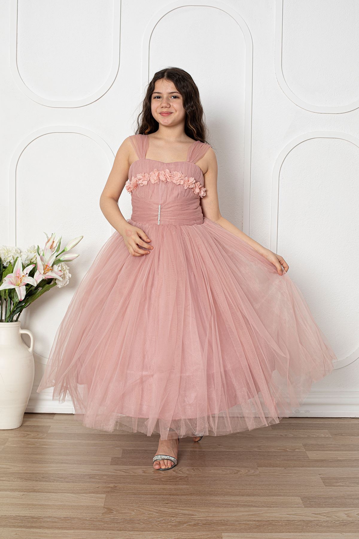 Göğüsü Çiçekli Kız Çocuk Abiye Elbise