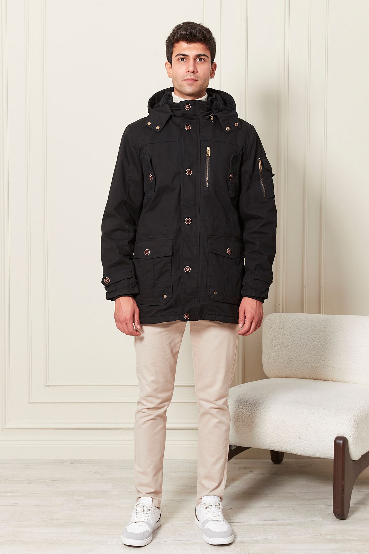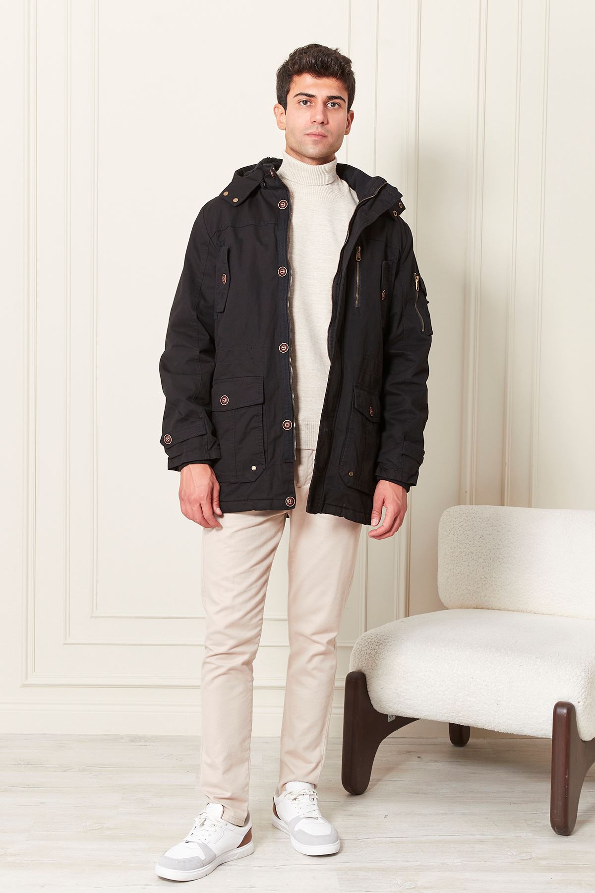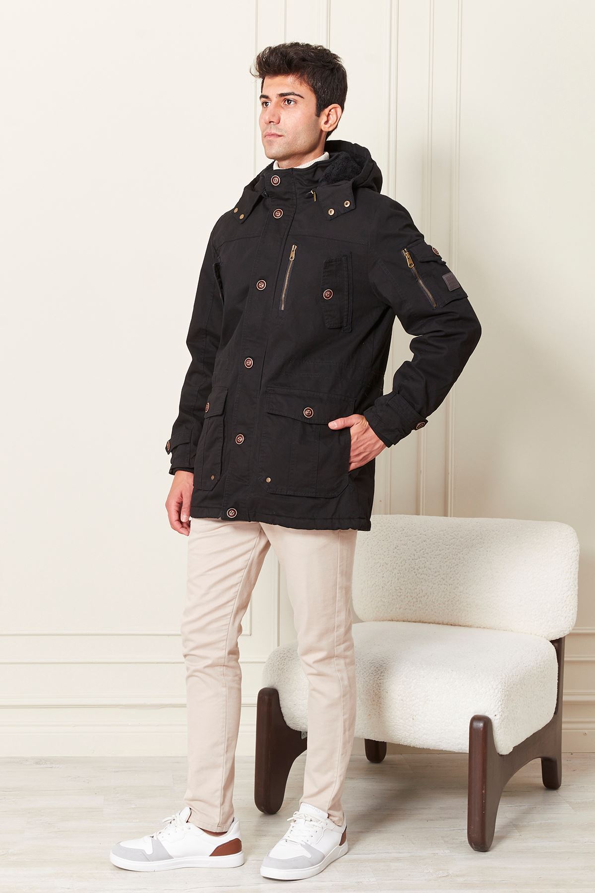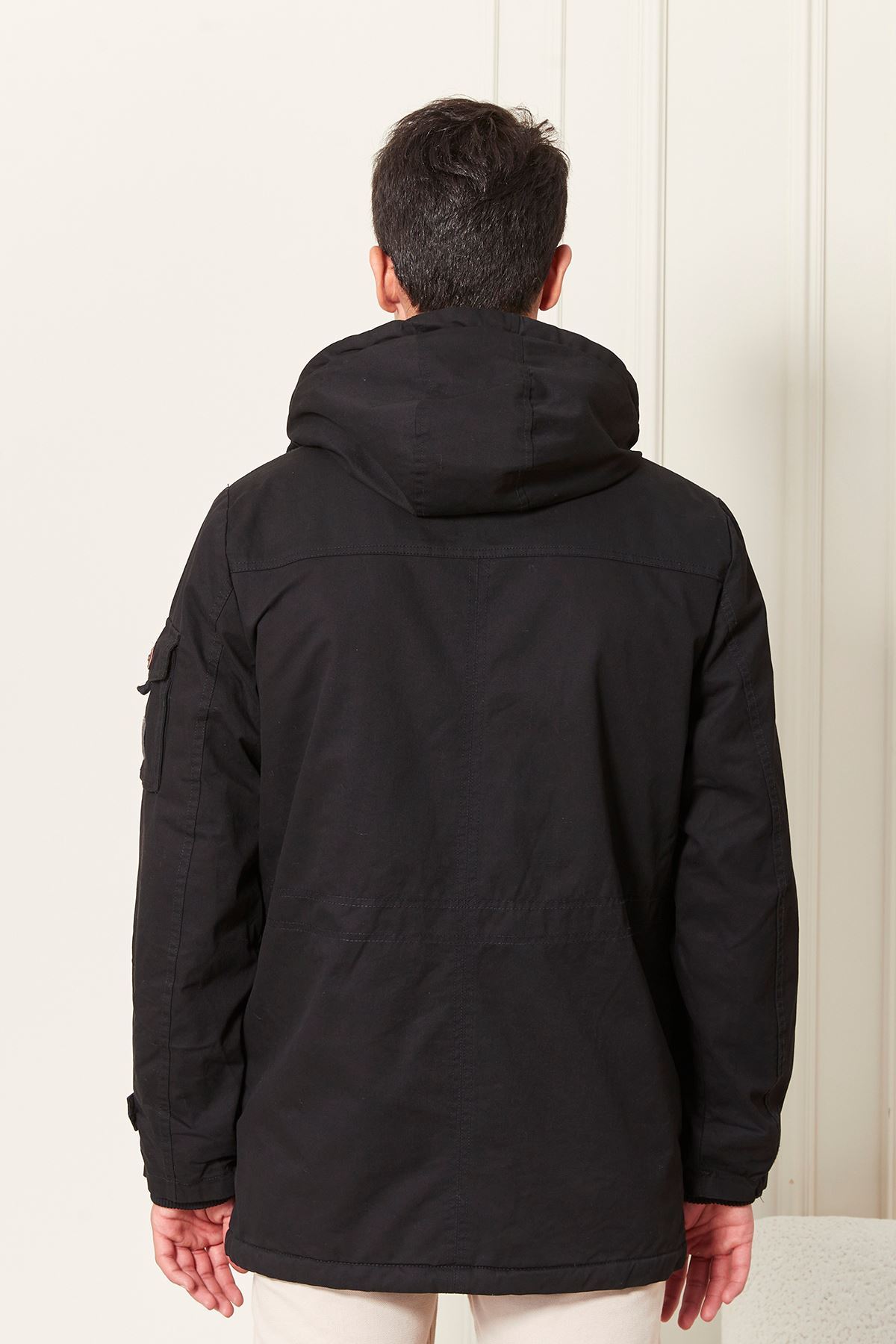 Kapşonlu İçi Yünlü Erkek Kaban