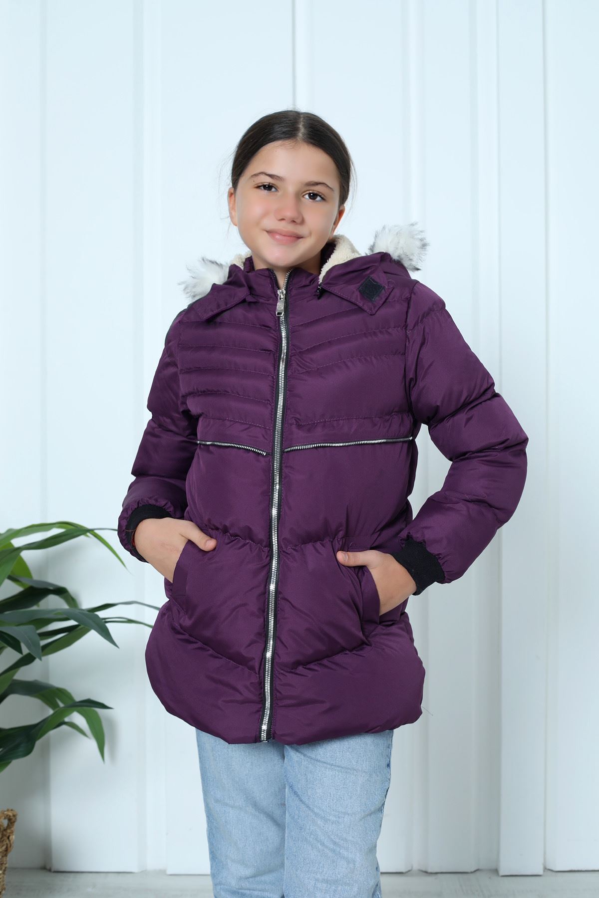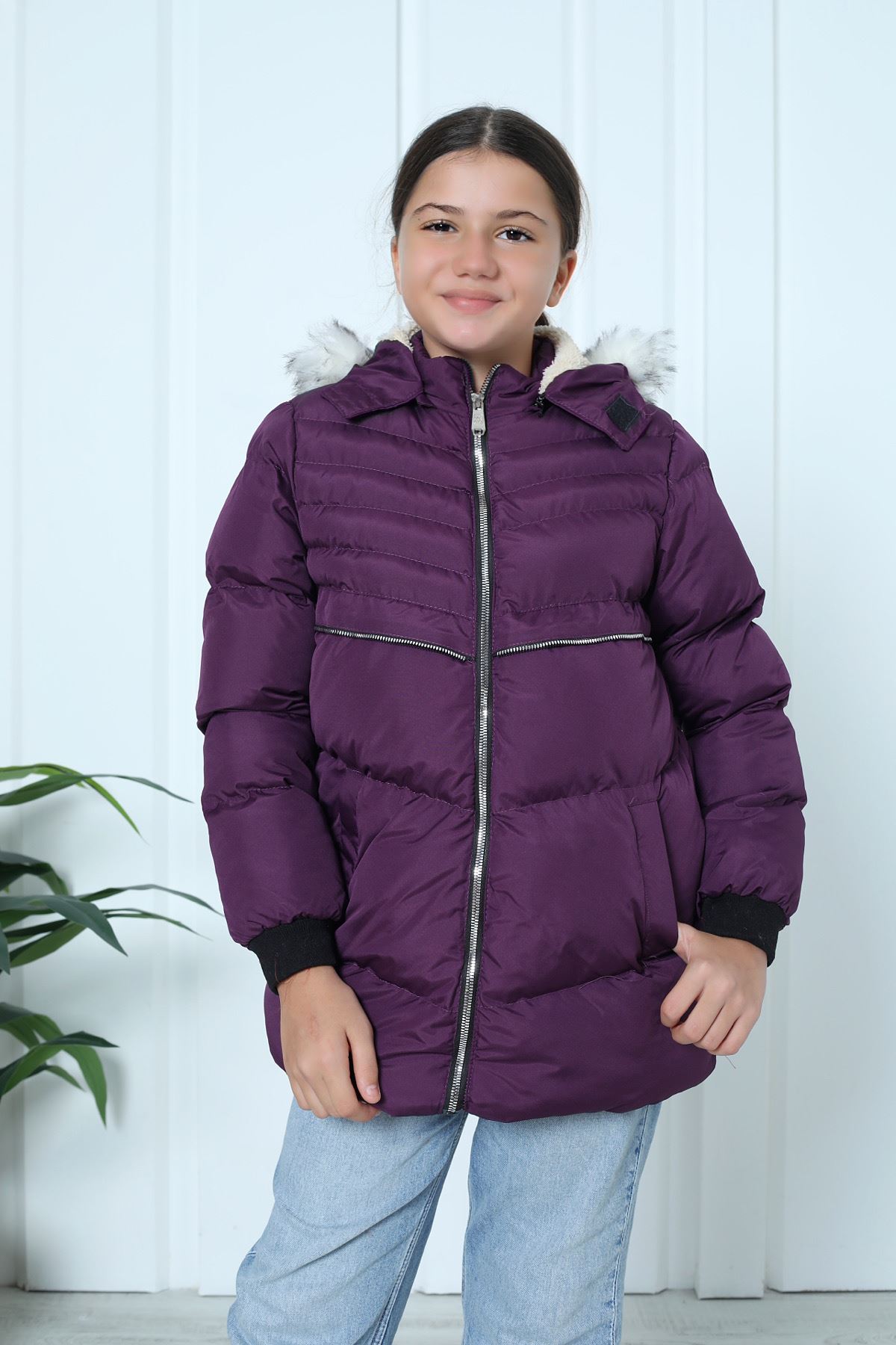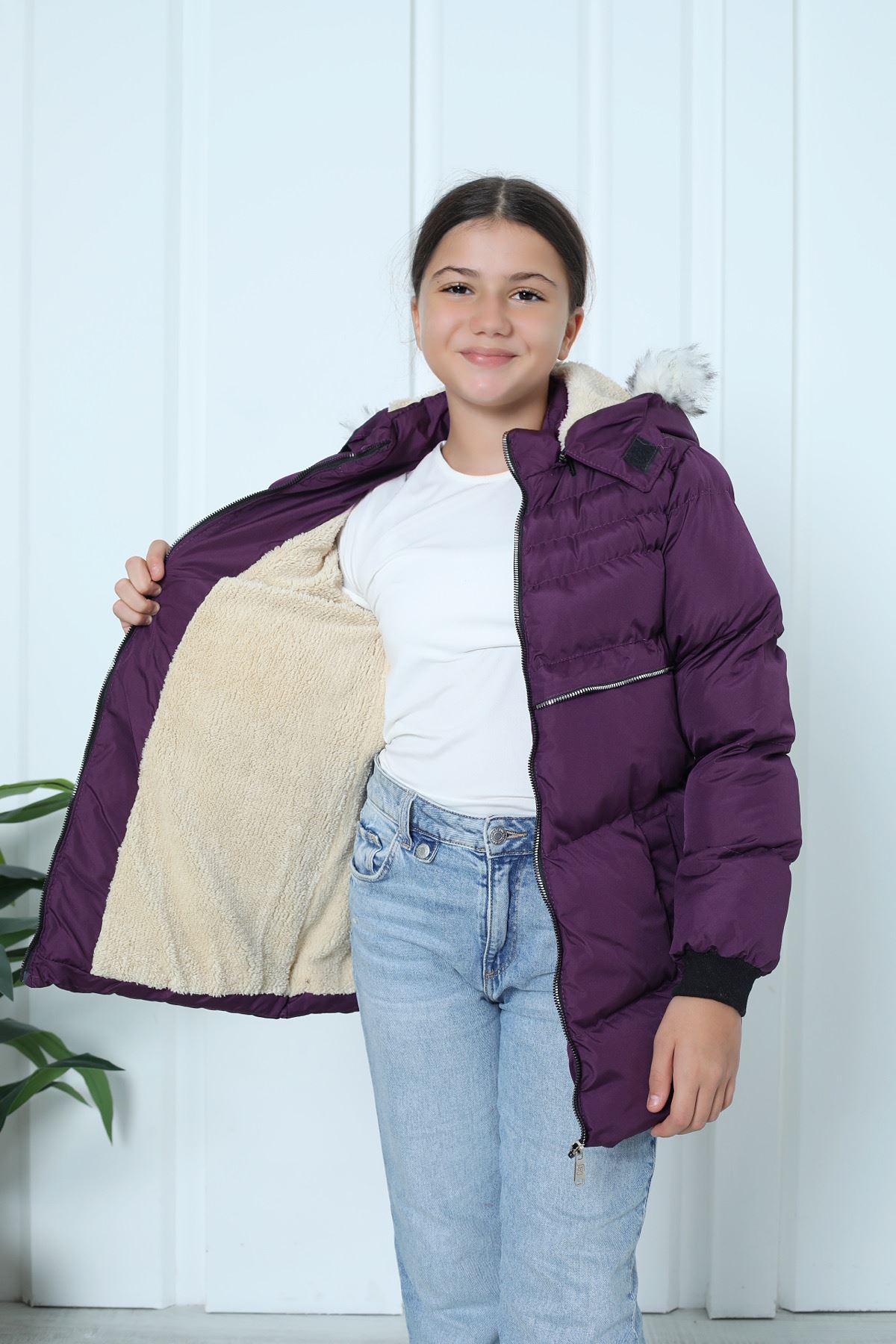 Kapşonlu İçi Yünlü Mor Çocuk Kaban