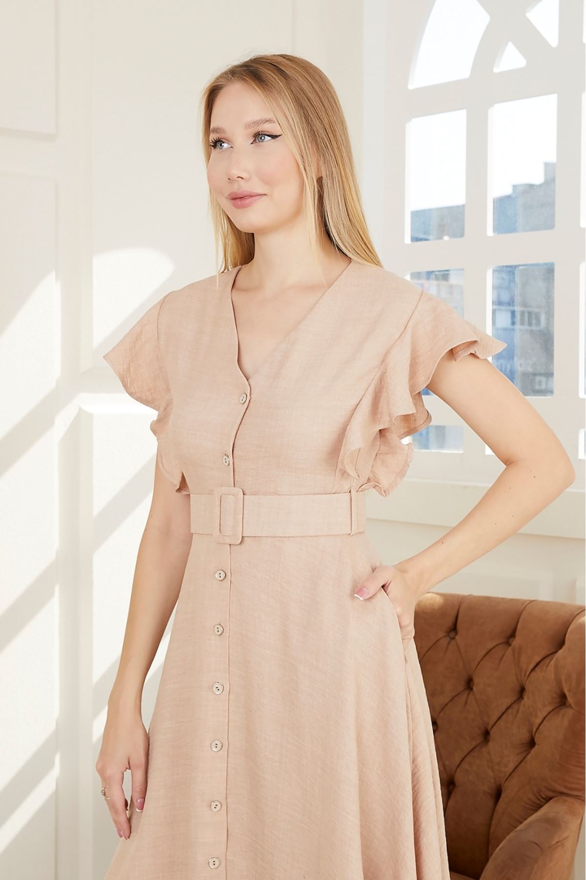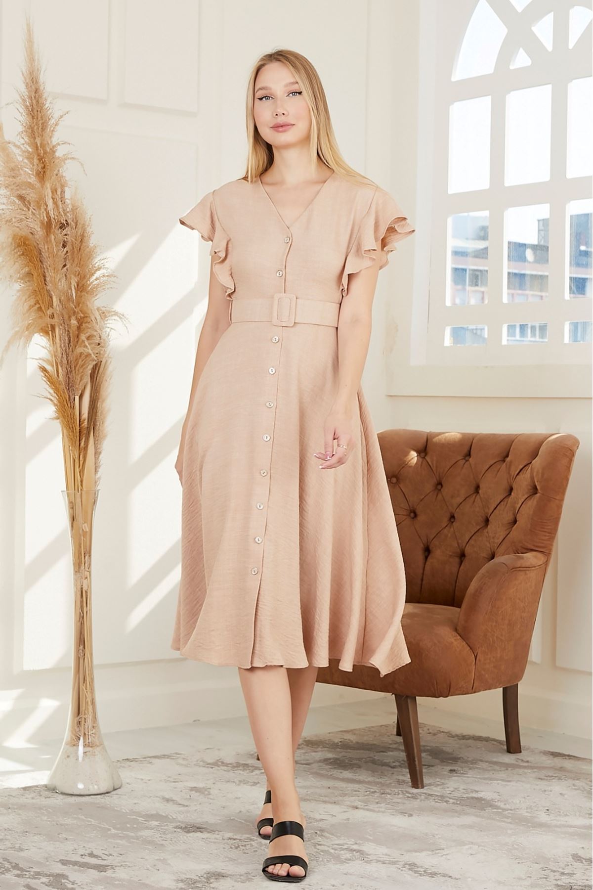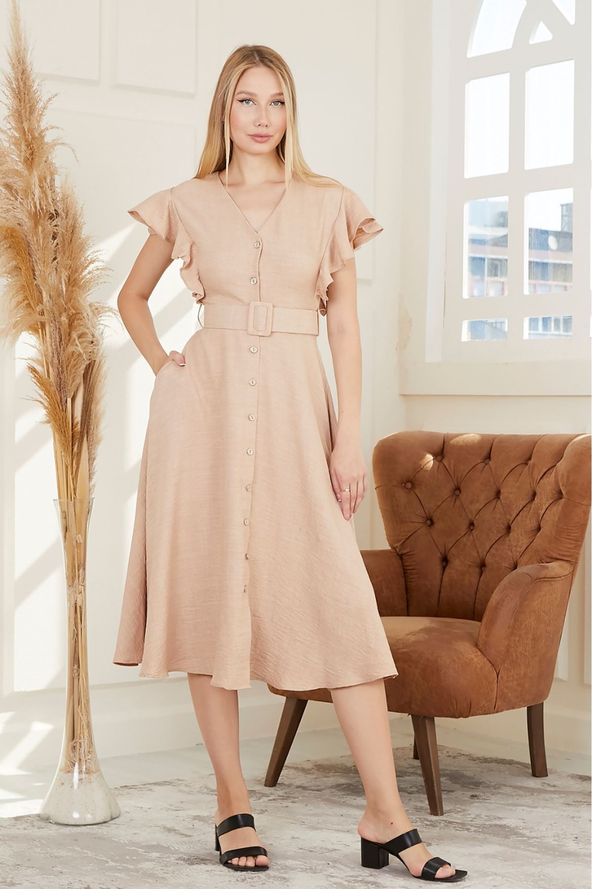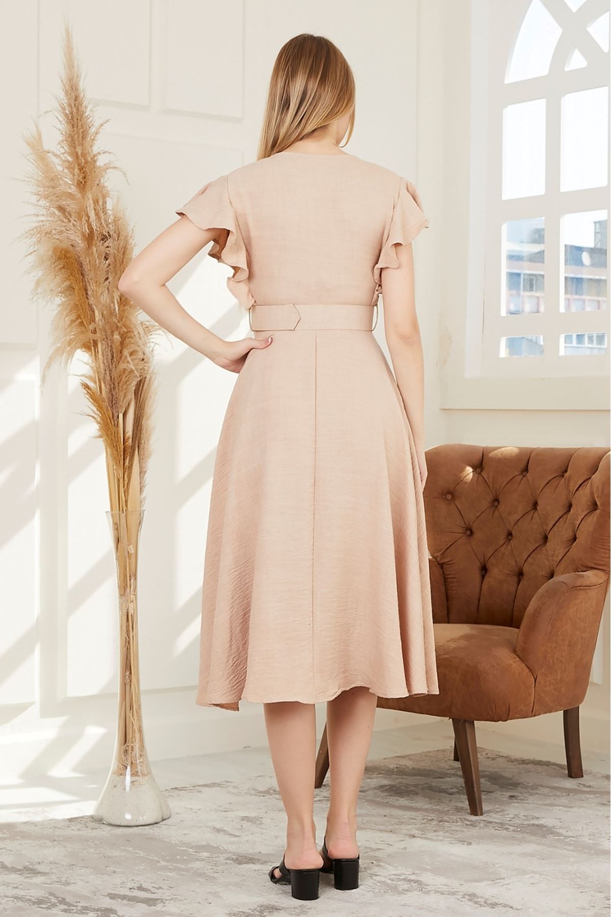Kolları Fırfırlı Beli Kemerli Kadın Elbise