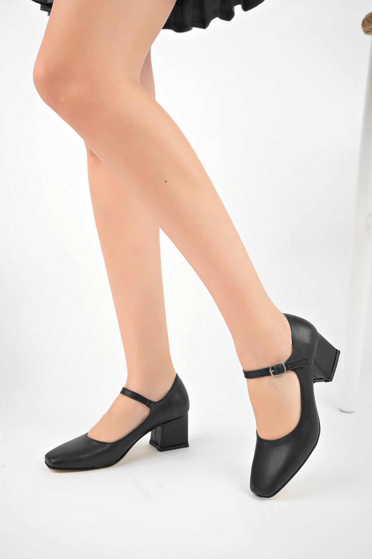 Köşeli Kalıp Tek Bant Siyah Cilt Kadın Ayakkabı