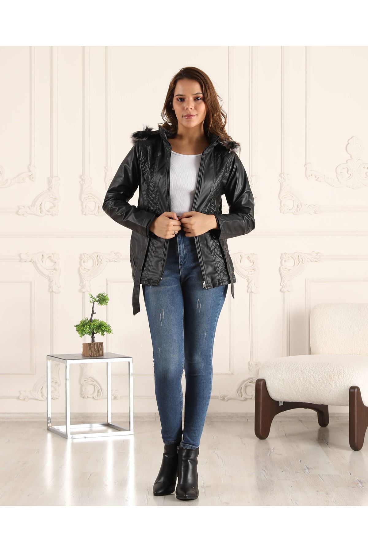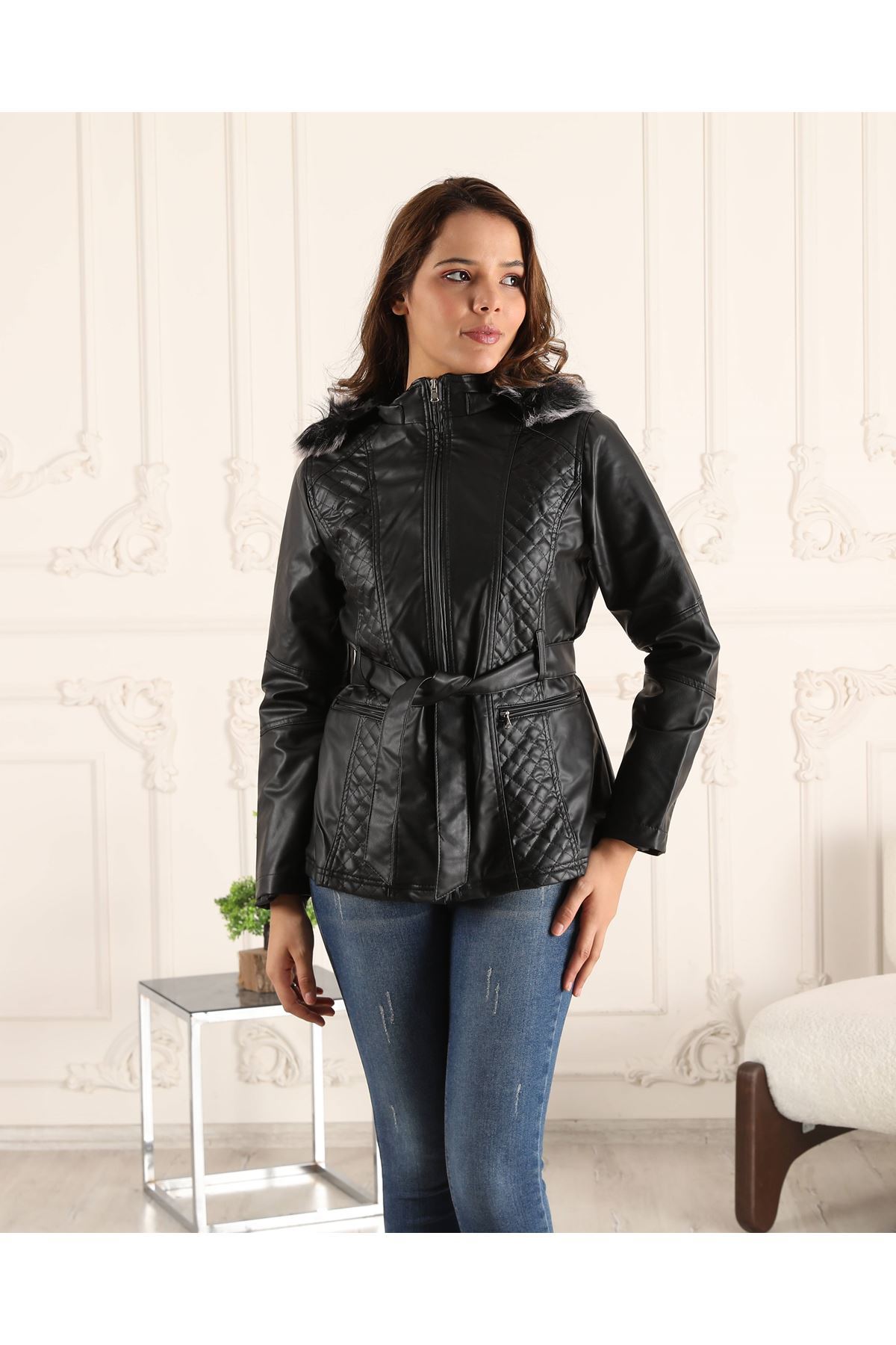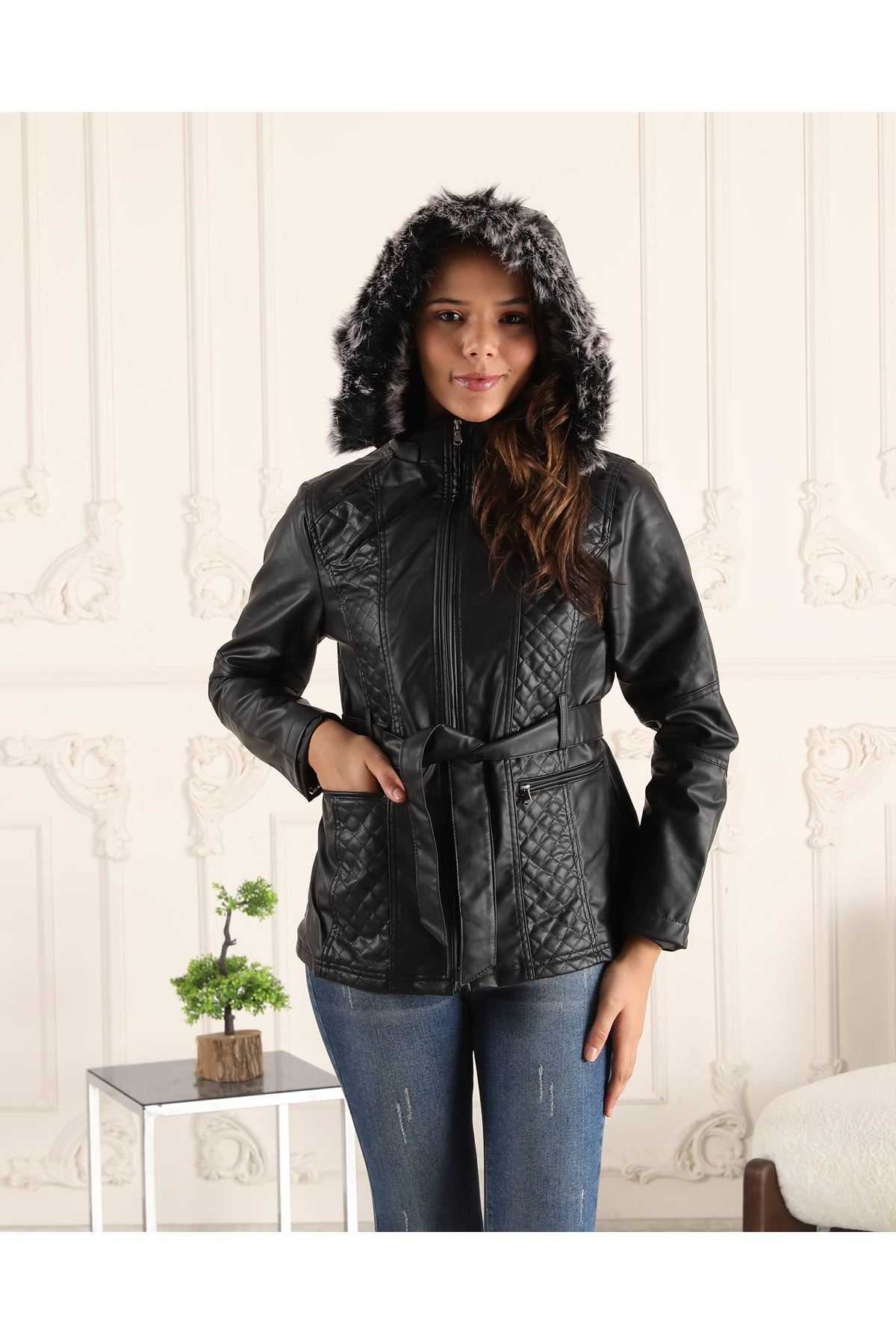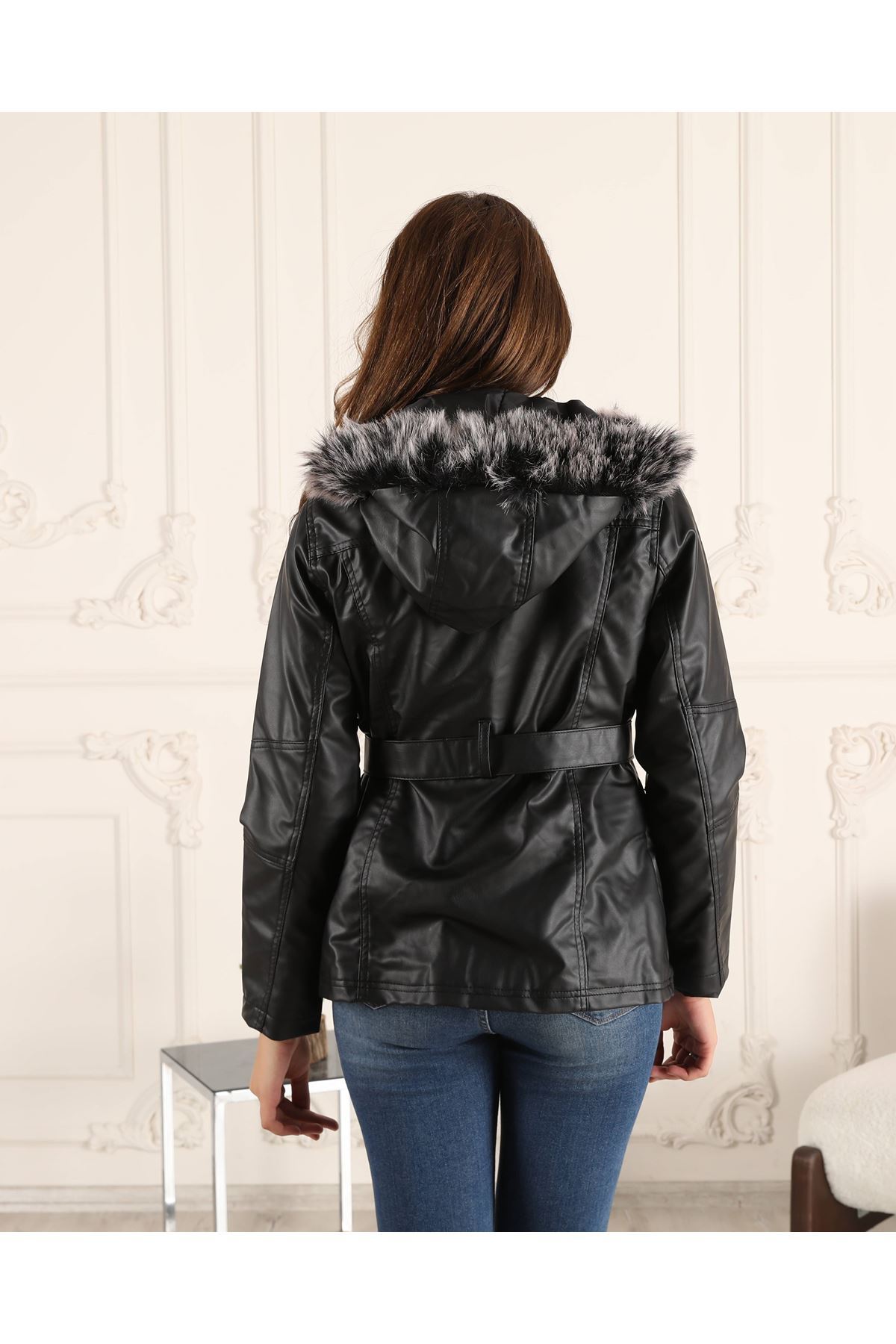Kuşaklı İçi Polar Kadın Deri Mont