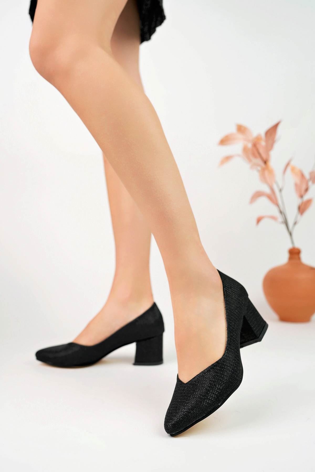 Ökçeli Sivri Kalıp Siyah Star Kadın Ayakkabı