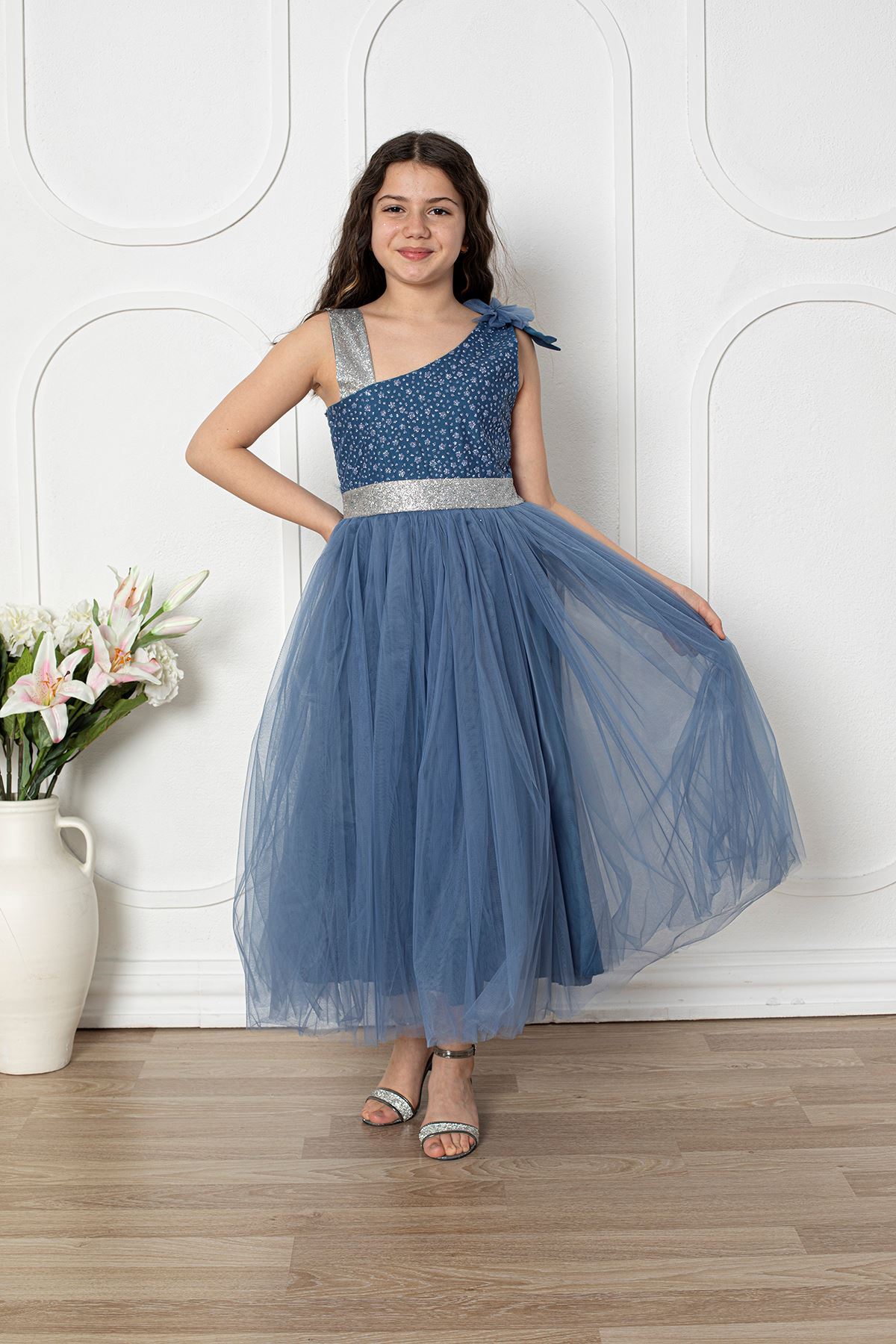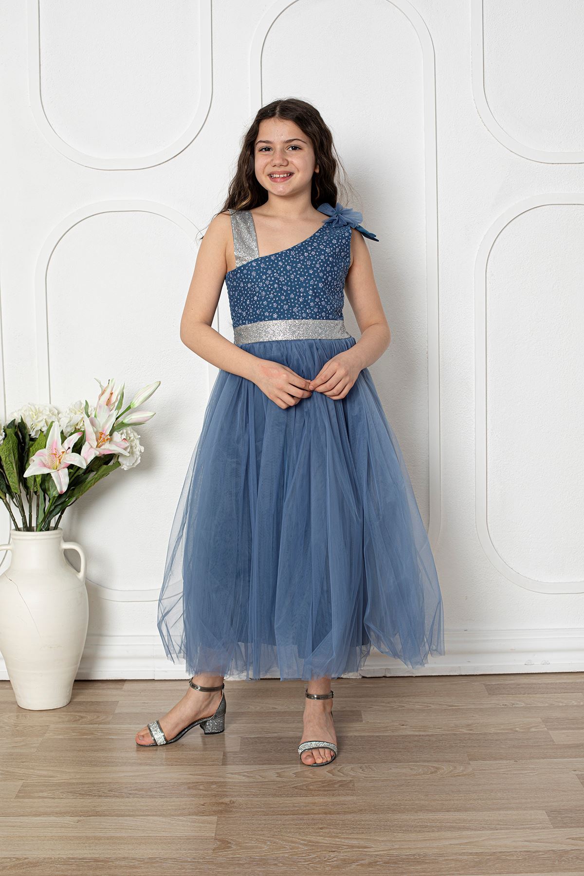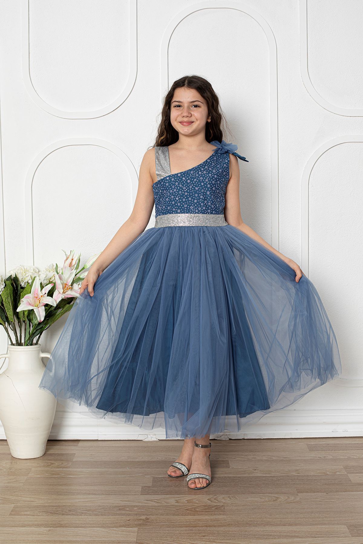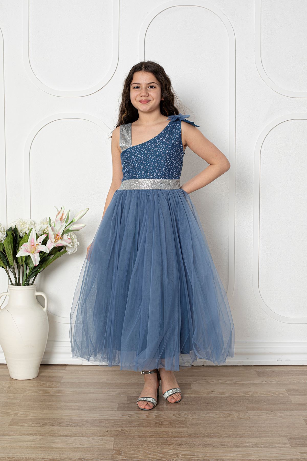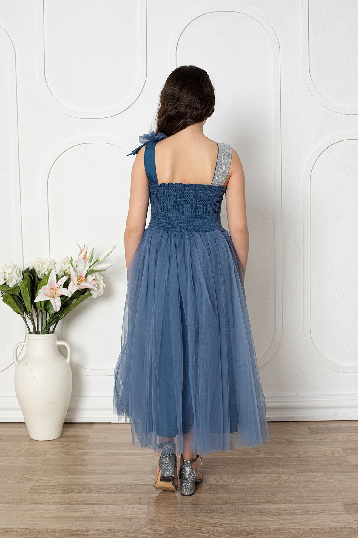 Omuzu Fiyonklu Kız Çocuk Abiye Elbise