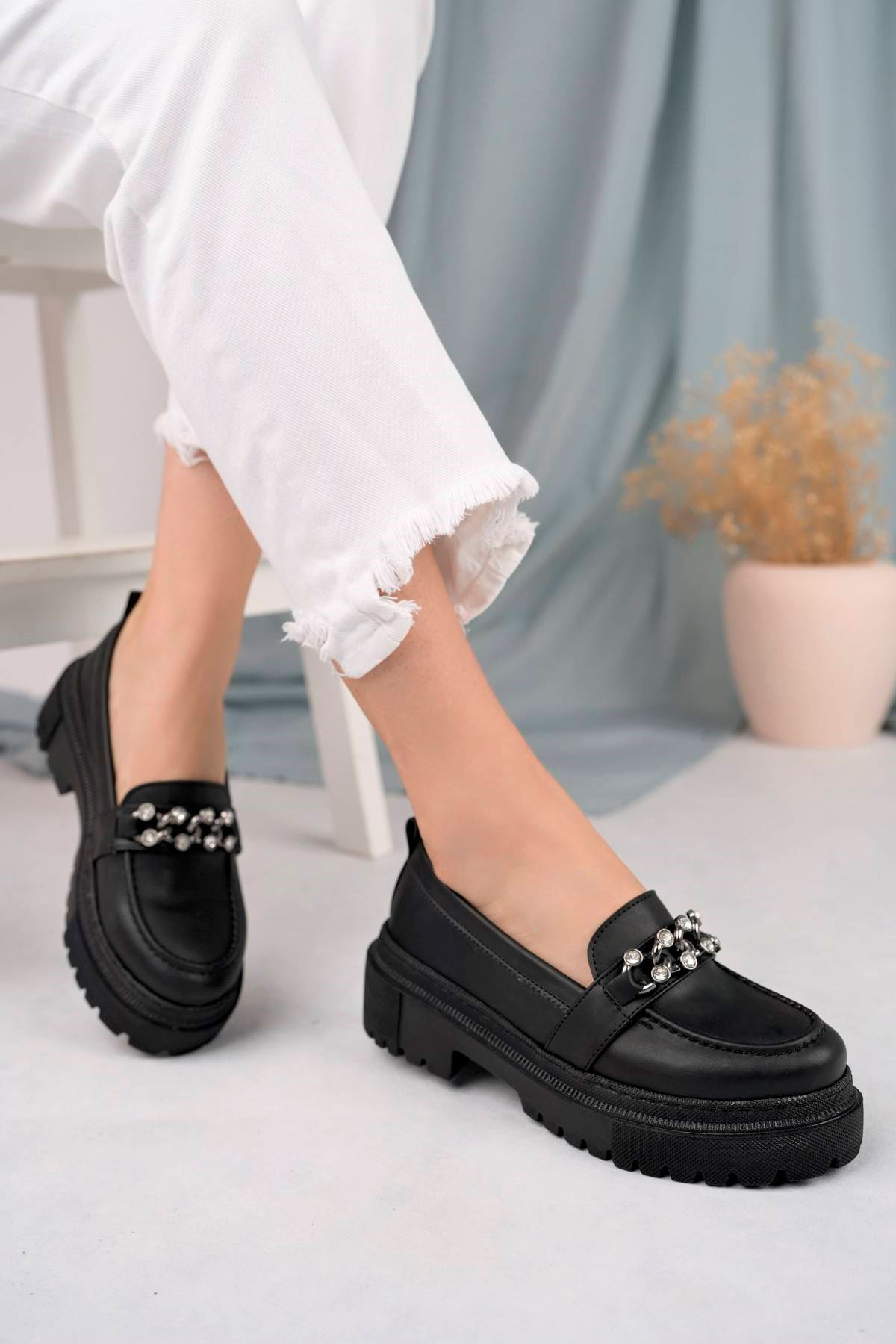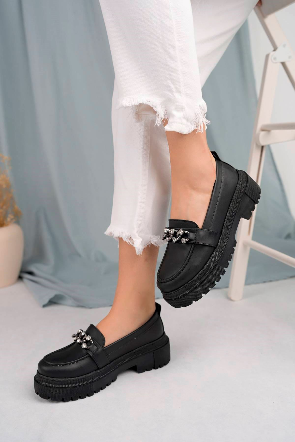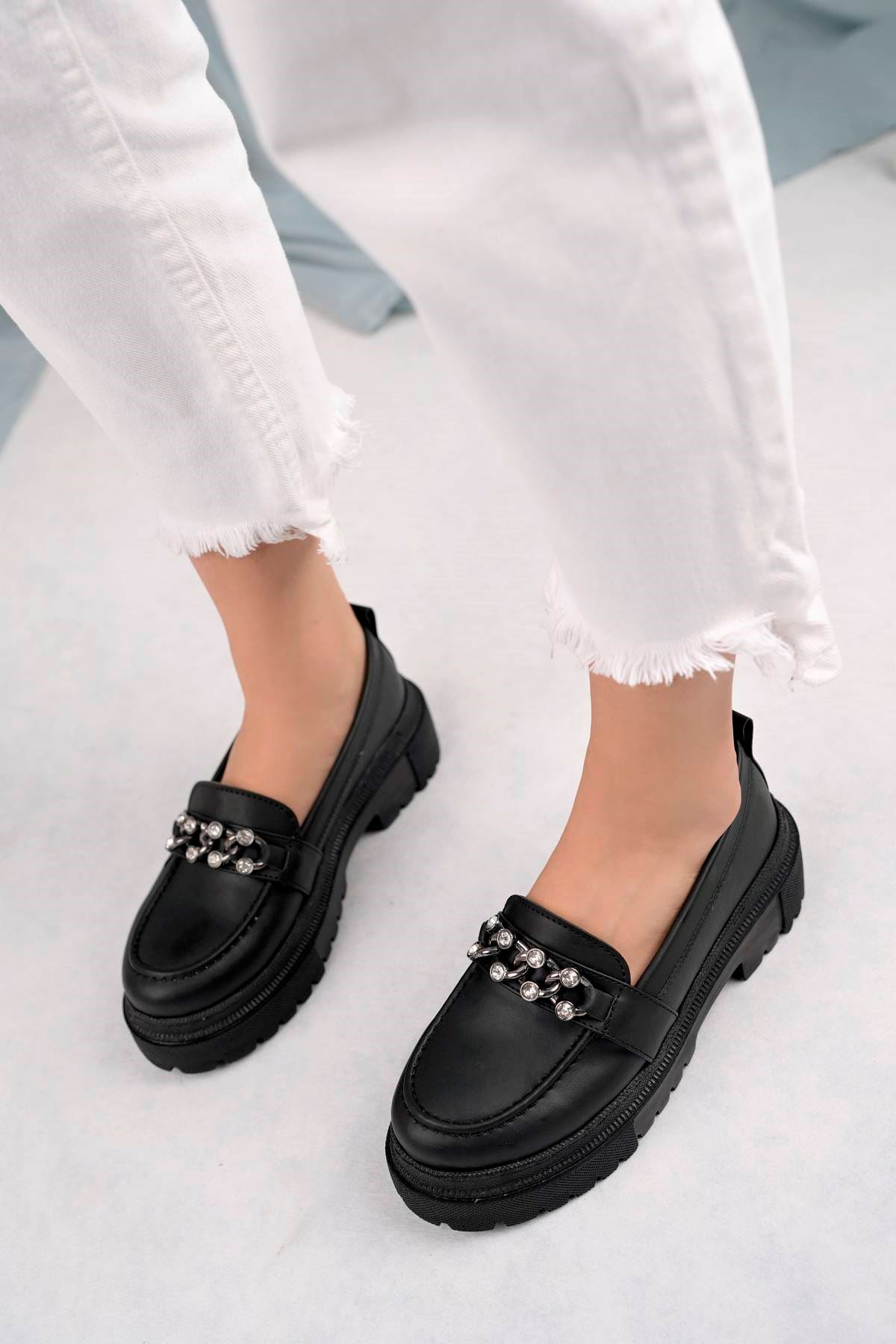Önü Zincirli Siyah Cilt Kadın Ayakkabı