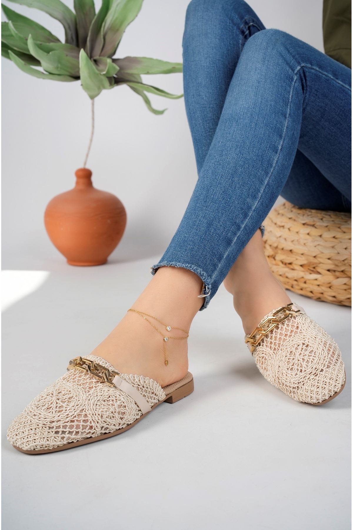 Örgülü Biyesi Tokalı Krem Kadın Terlik