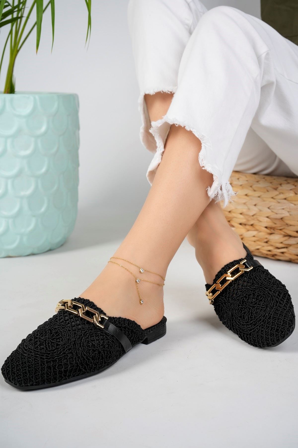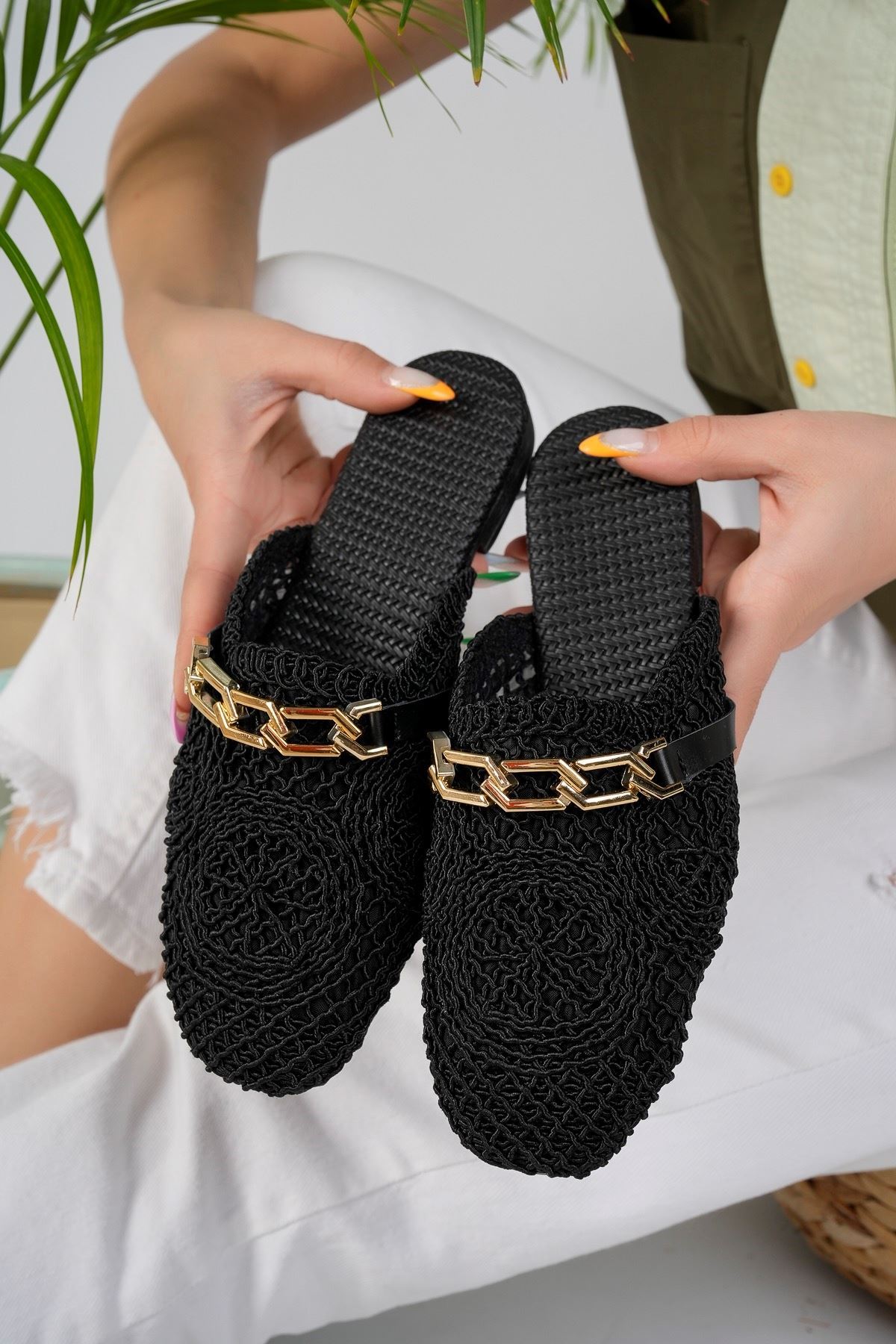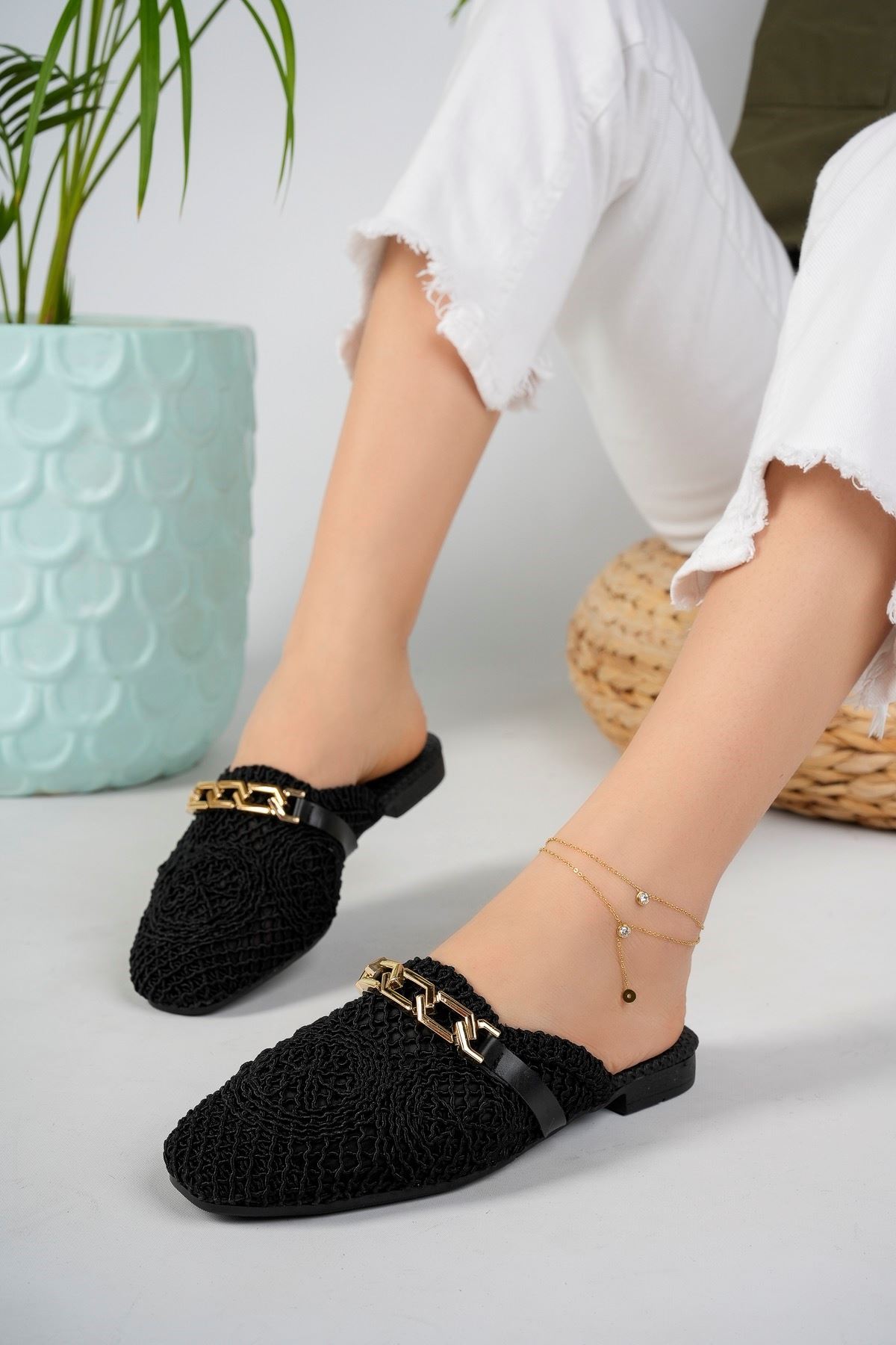 Örgülü Biyesi Tokalı Siyah Kadın Terlik