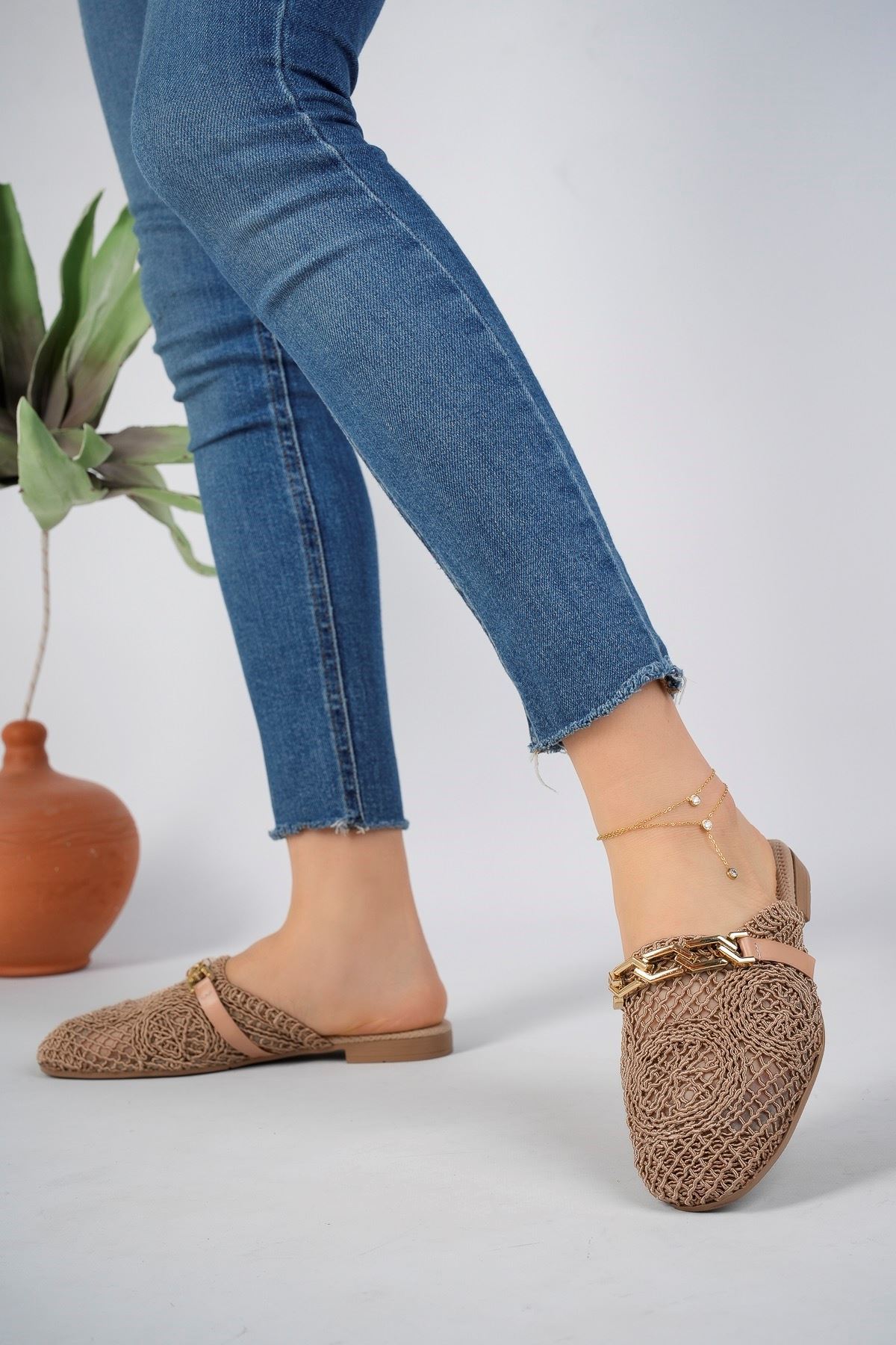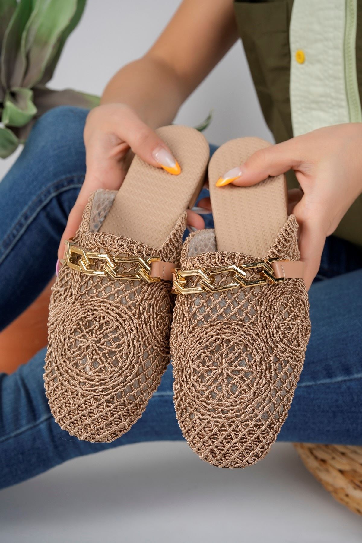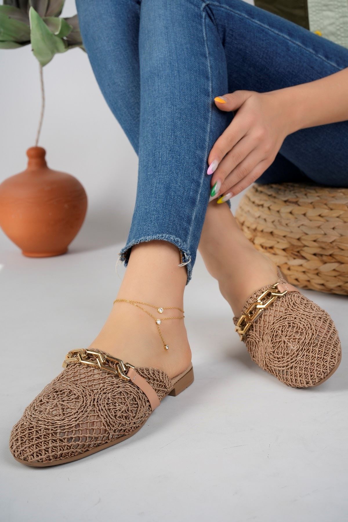 Örgülü Biyesi Tokalı Vizon Kadın Terlik