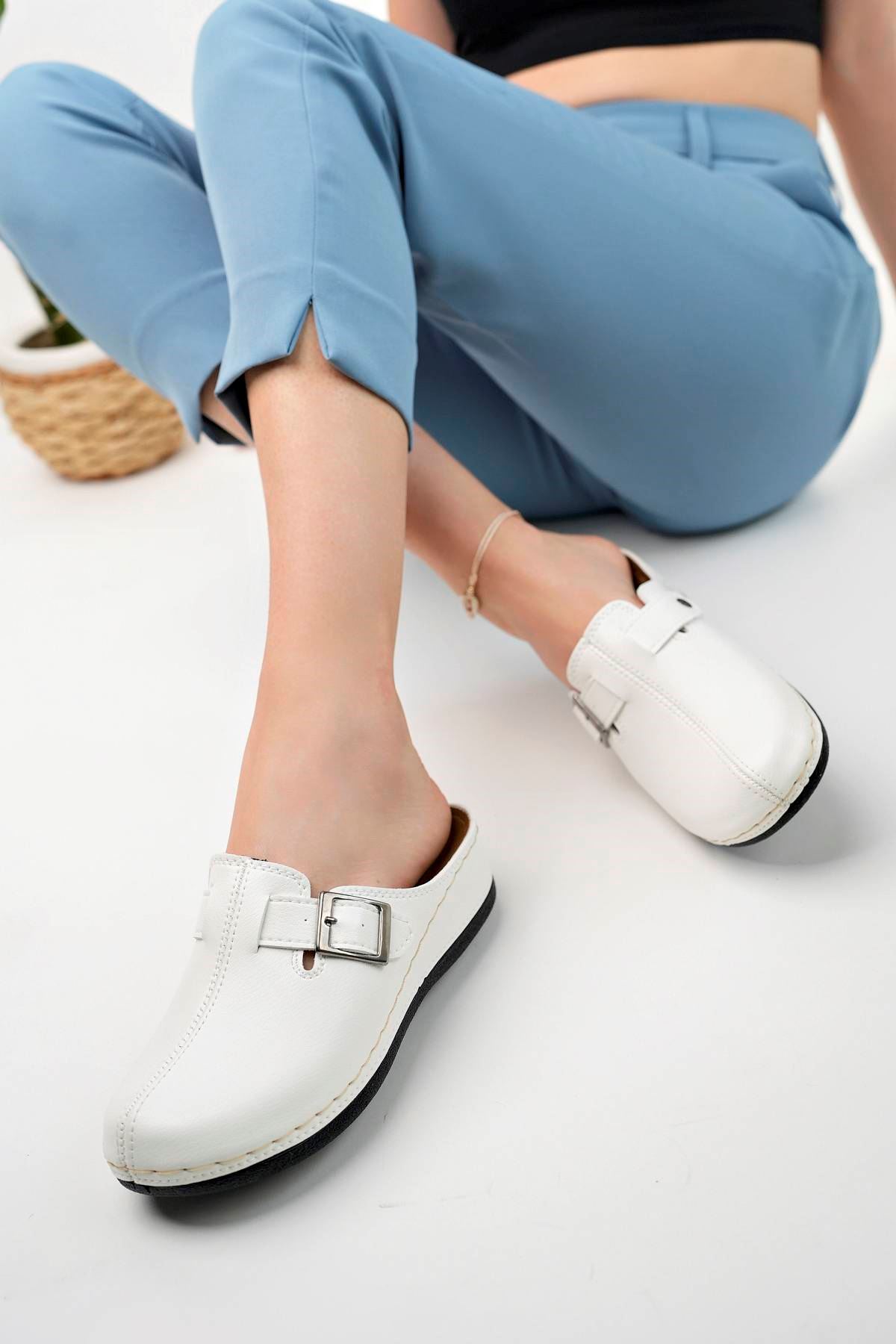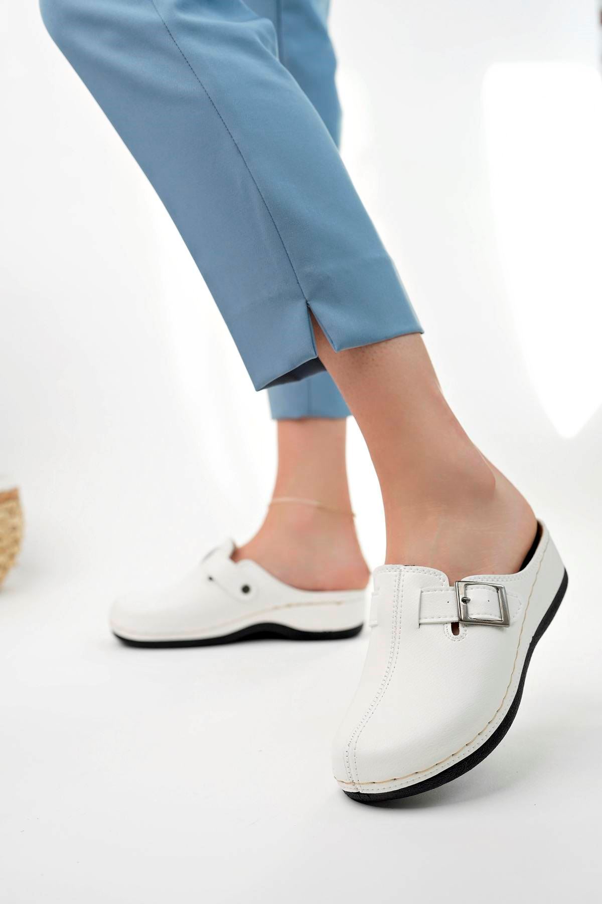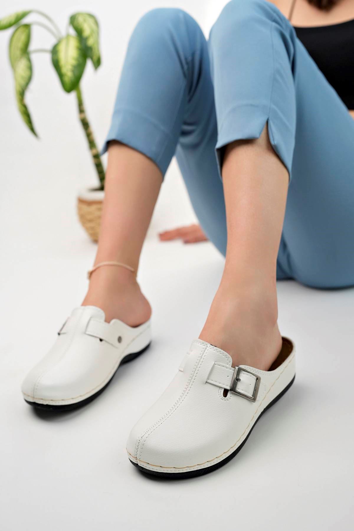 Ortopedik Ped Burnu Kapalı Tokalı Beyaz Terlik