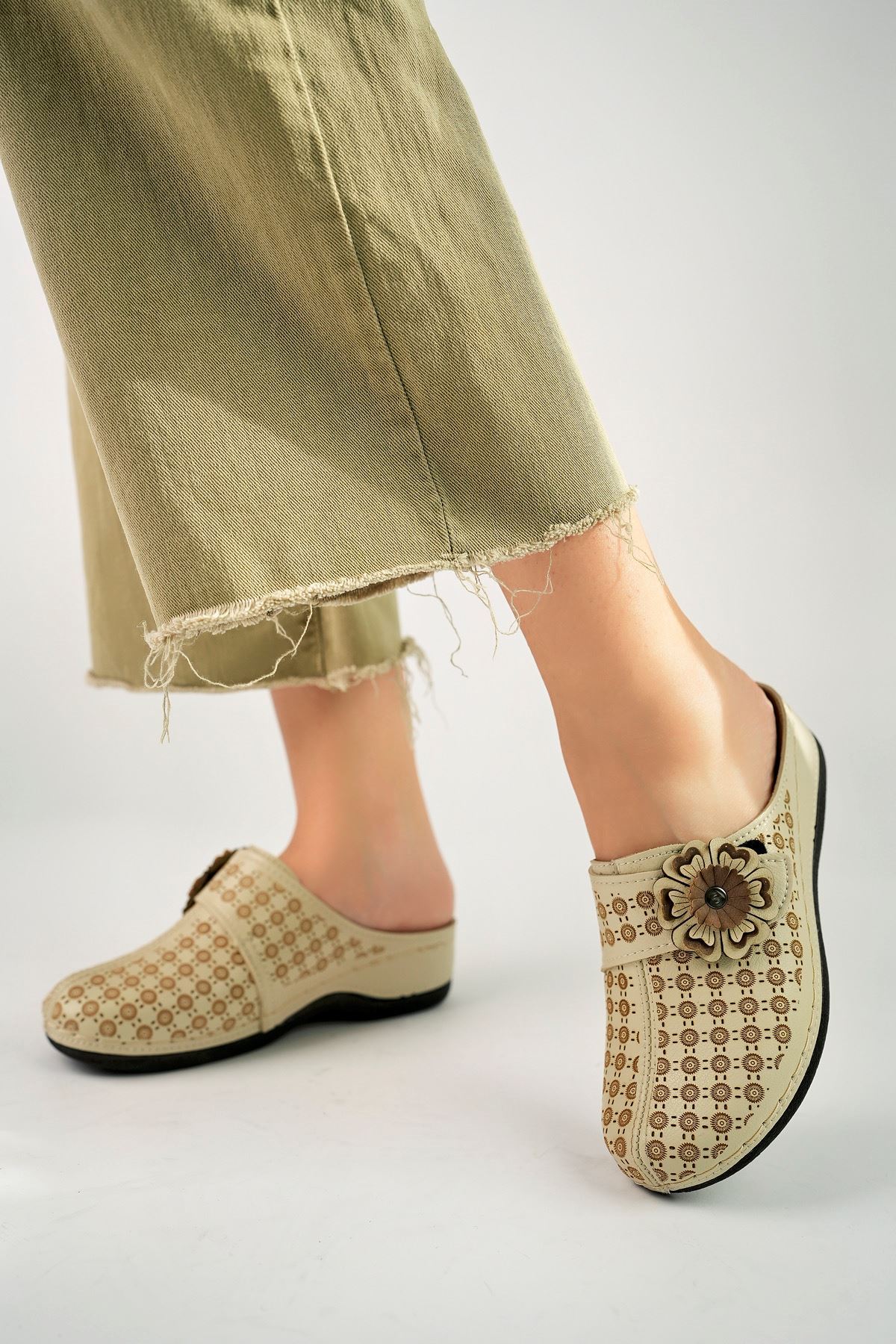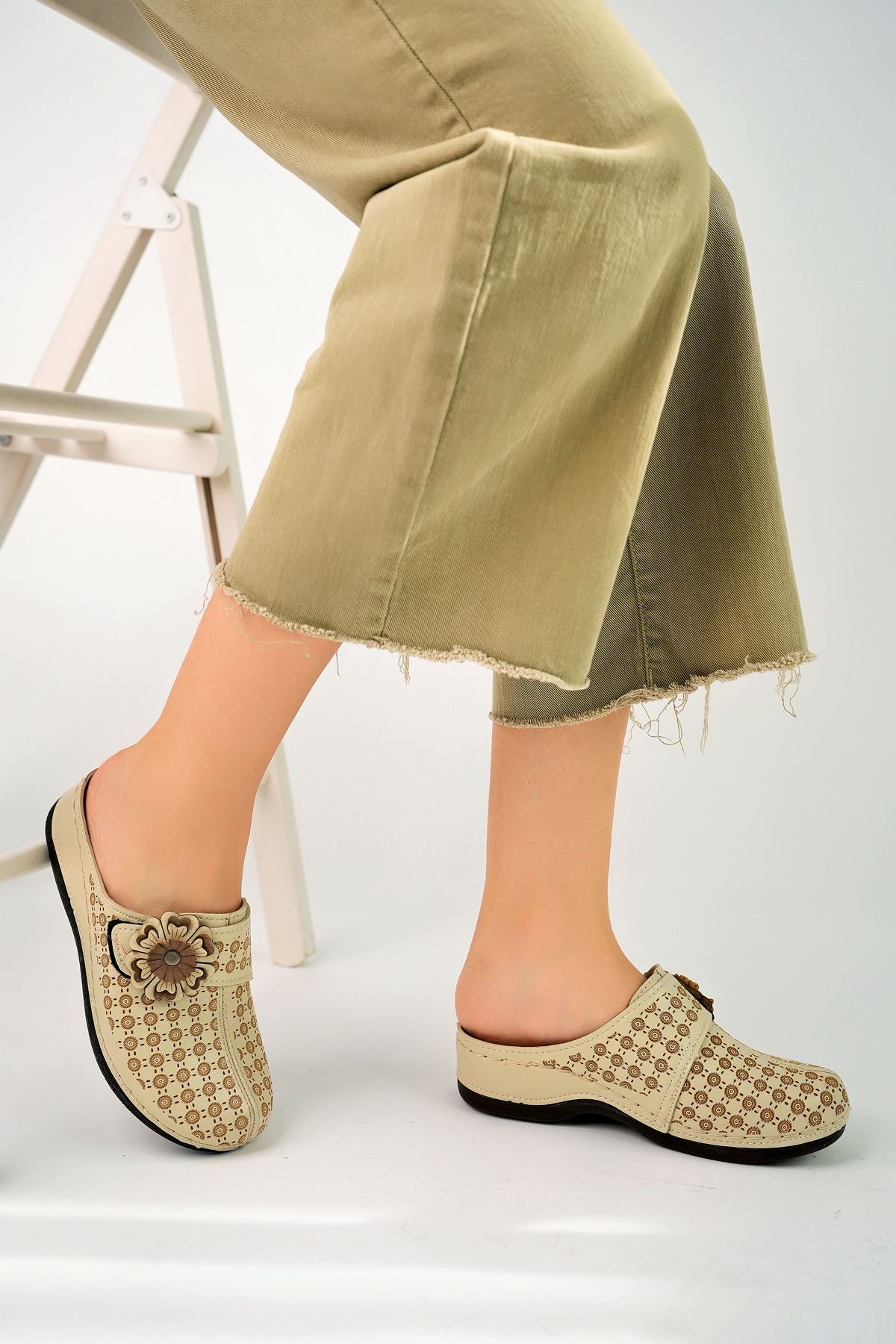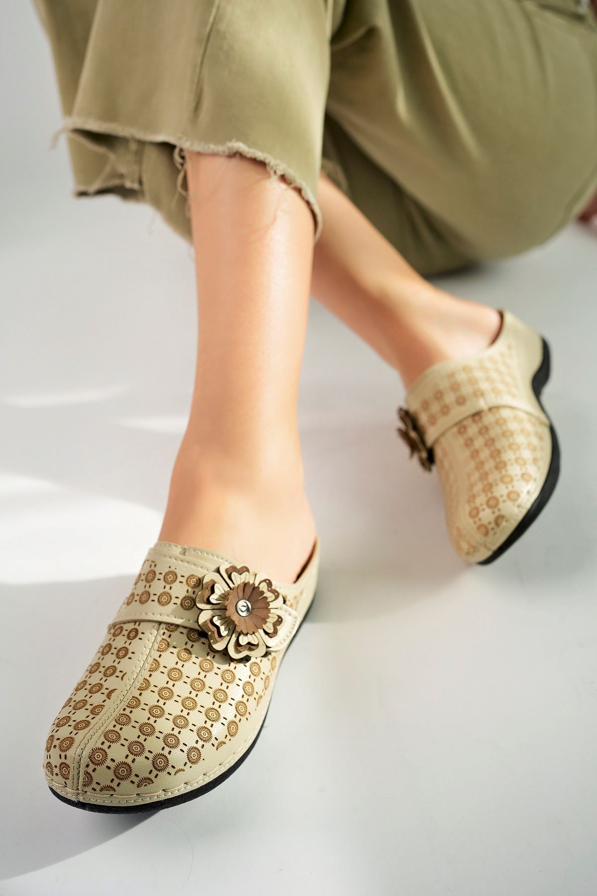 Ortopedik Taban Burnu Kapalı Çiçekli Krem Kadın Terlik
