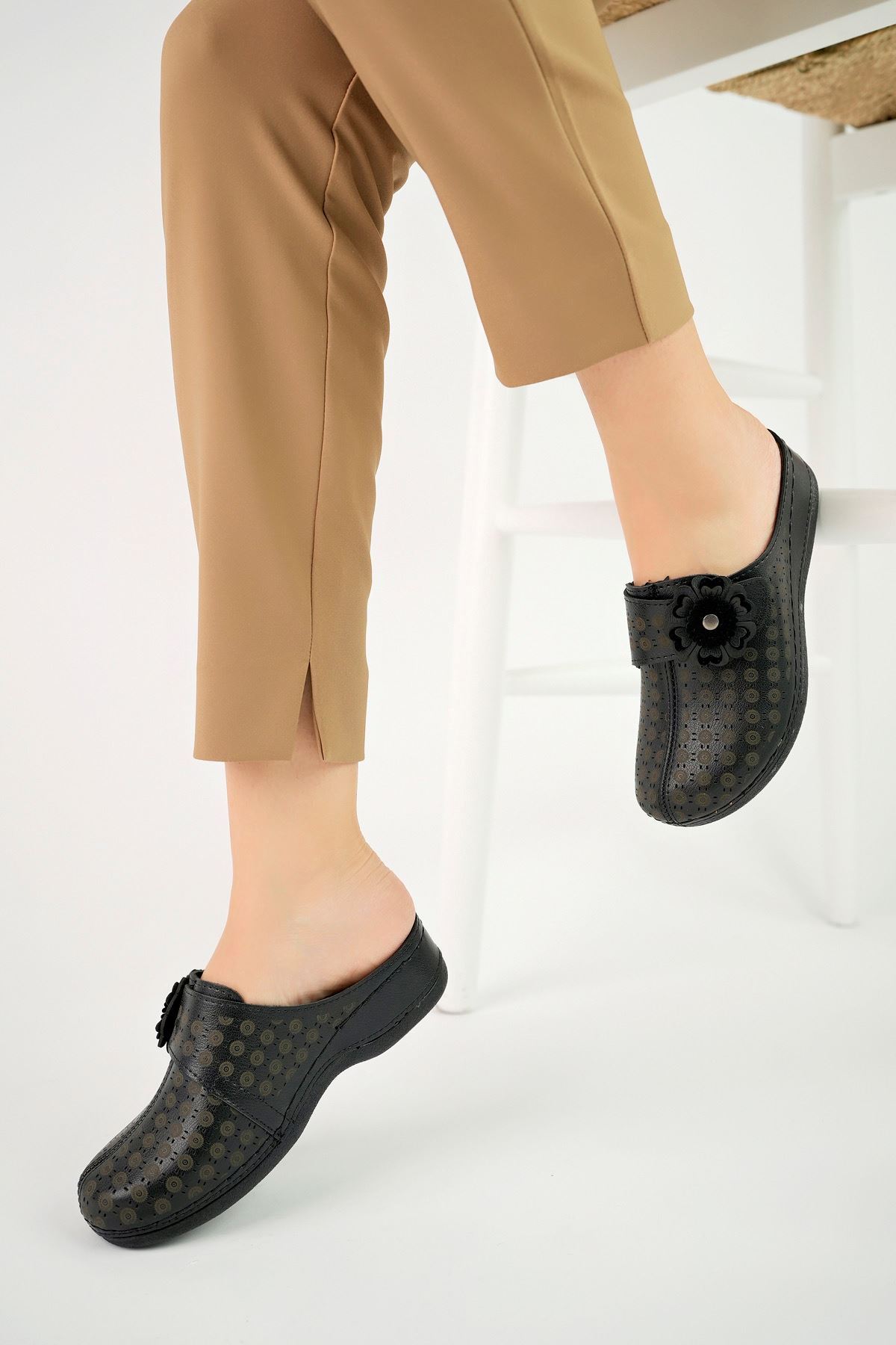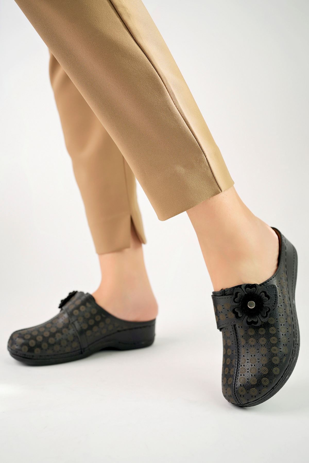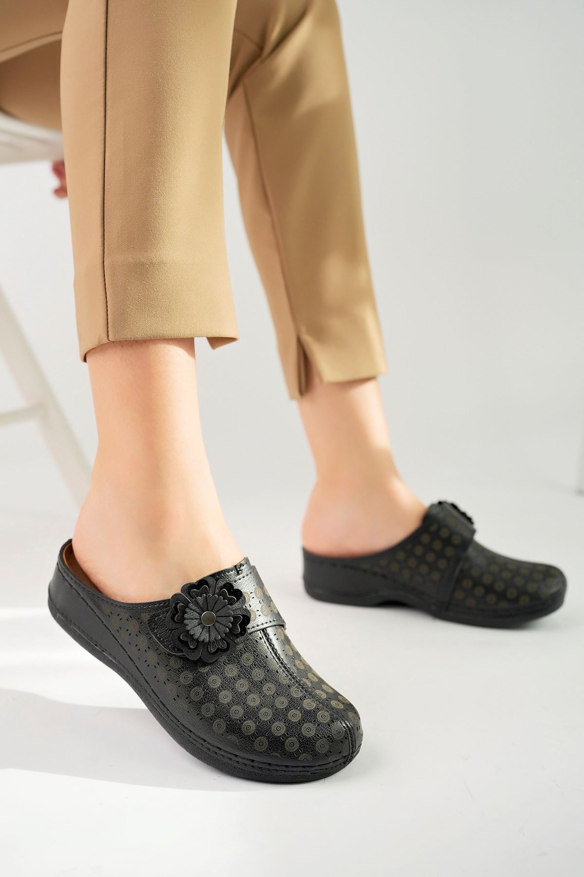 Ortopedik Taban Burnu Kapalı Çiçekli Siyah Kadın Terlik