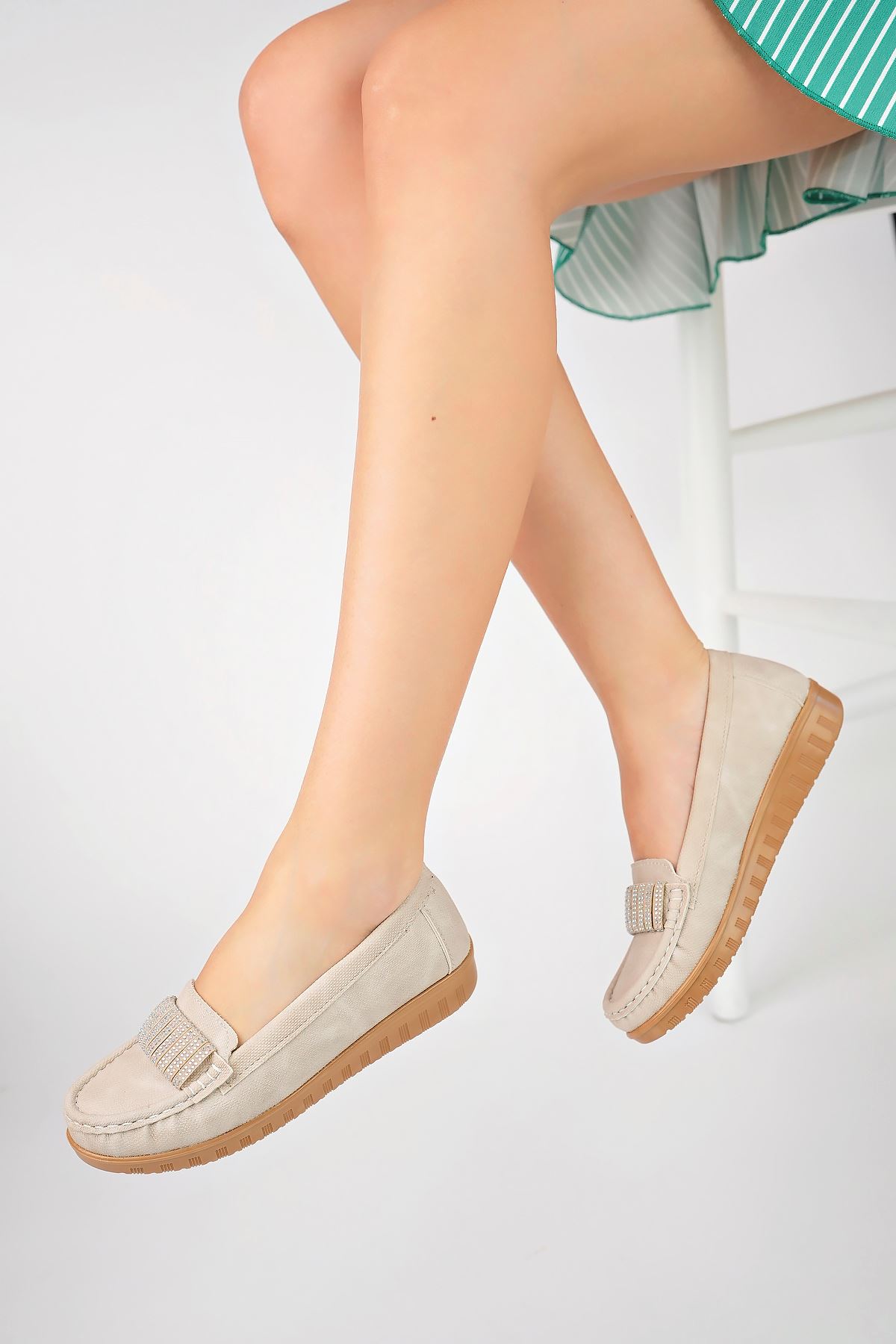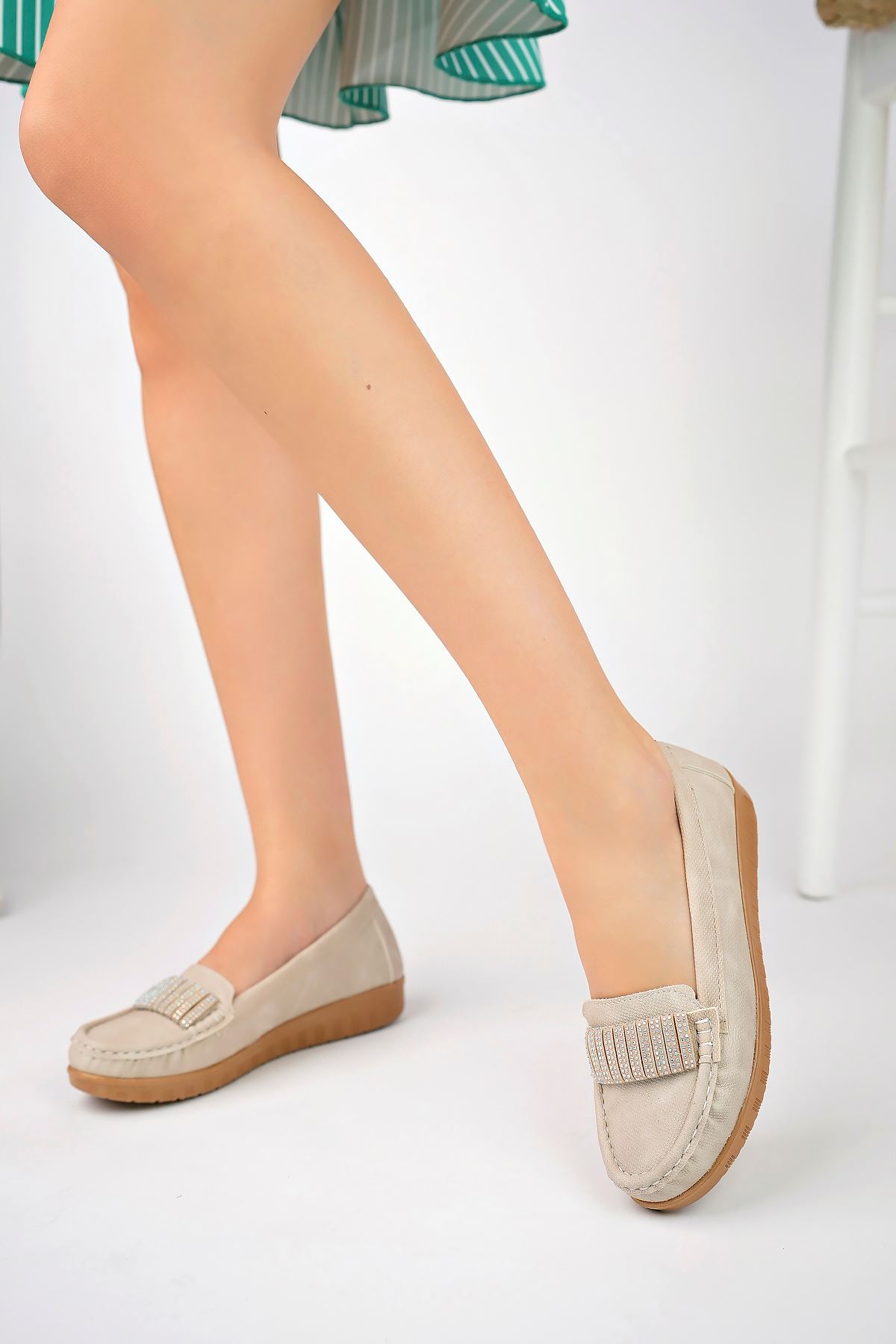 Ortopedik Taban Saraçlı Taşlı Bej Kadın Ayakkabı