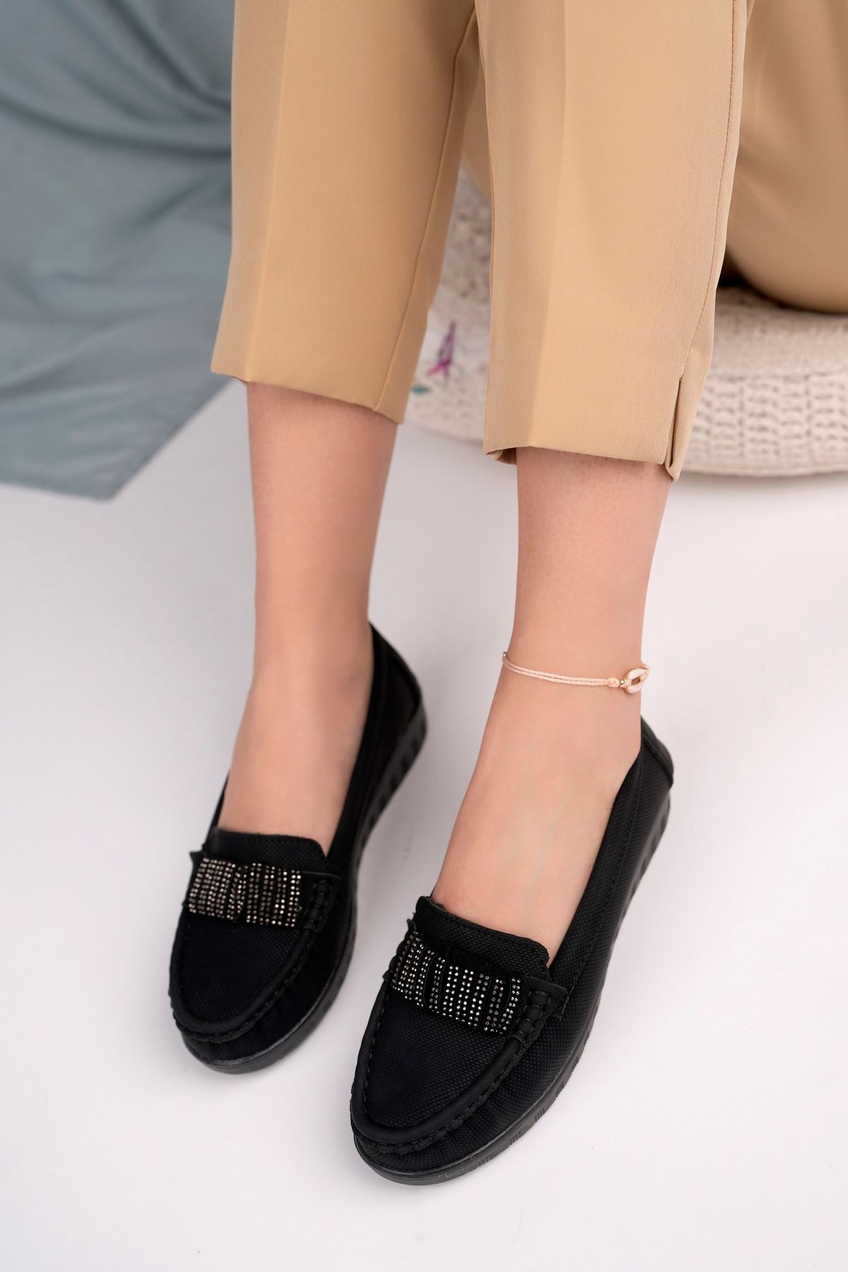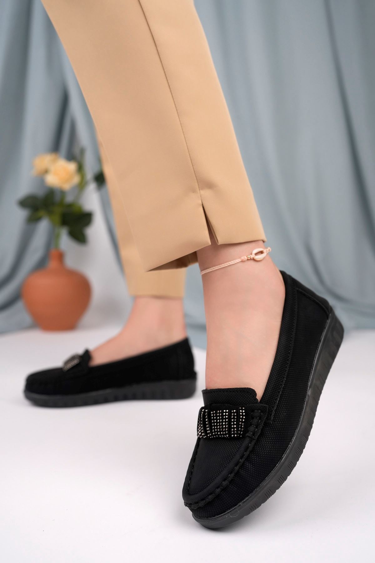 Ortopedik Taban Saraçlı Taşlı Siyah Kadın Ayakkabı