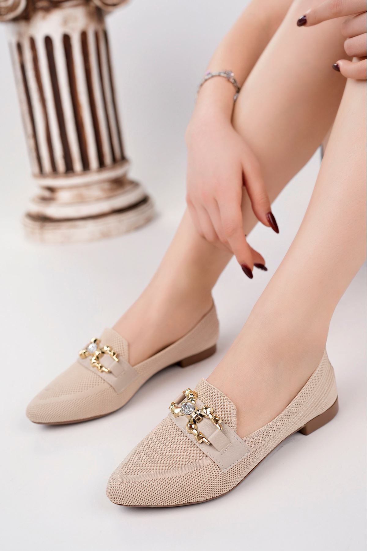 Sivri Kalıp Krem Tokalı Triko Ayakkabı