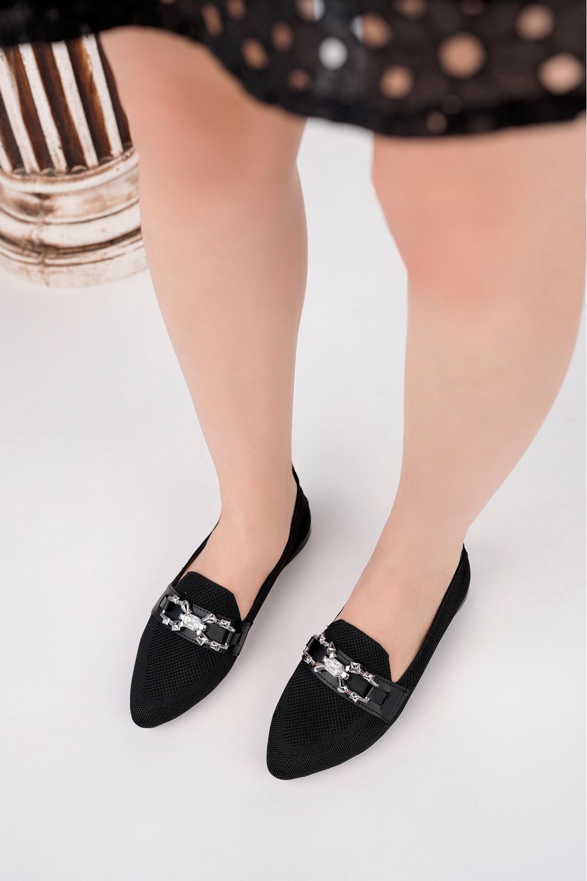 Sivri Kalıp Siyah Tokalı Triko Ayakkabı