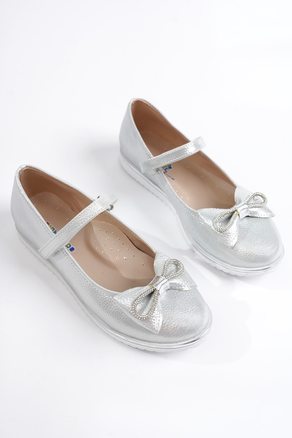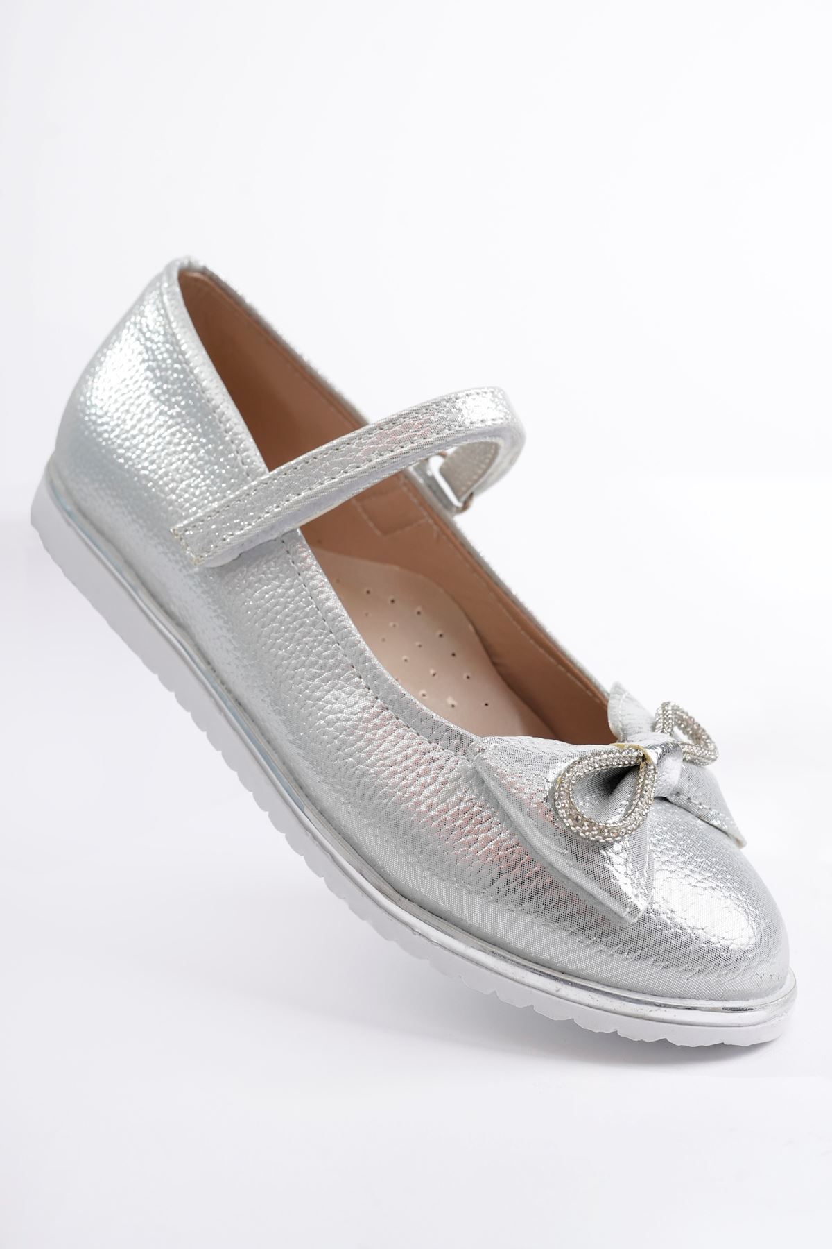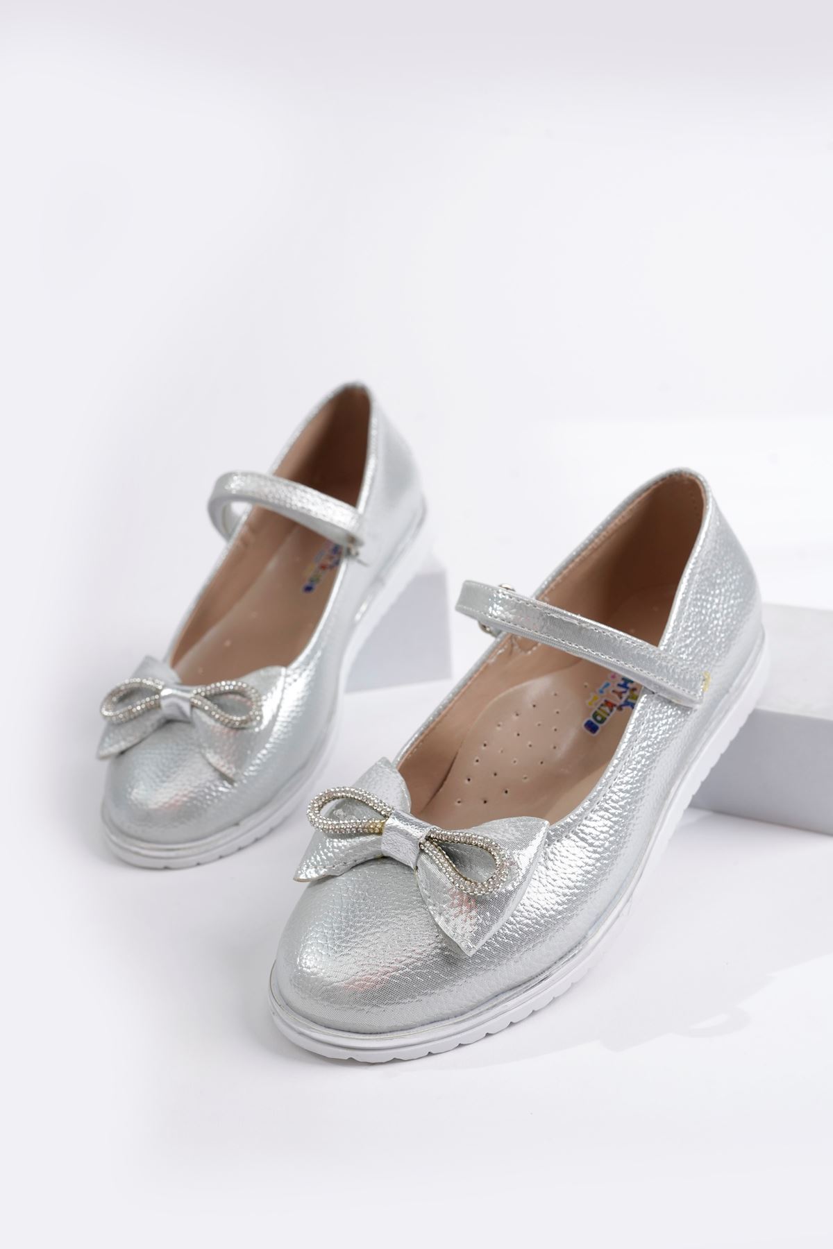 Taşlı Fiyonk Gümüş Parlak Kız Çocuk Ayakkabı