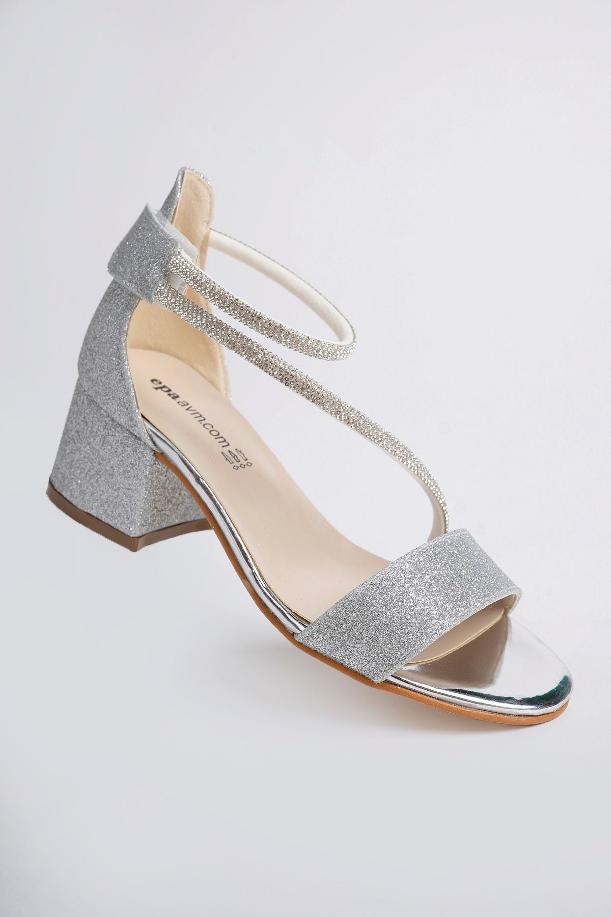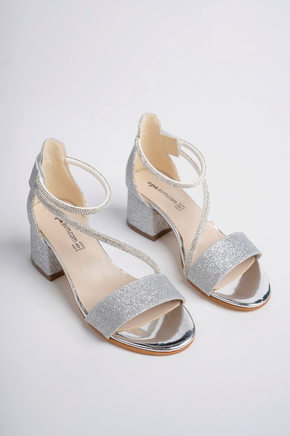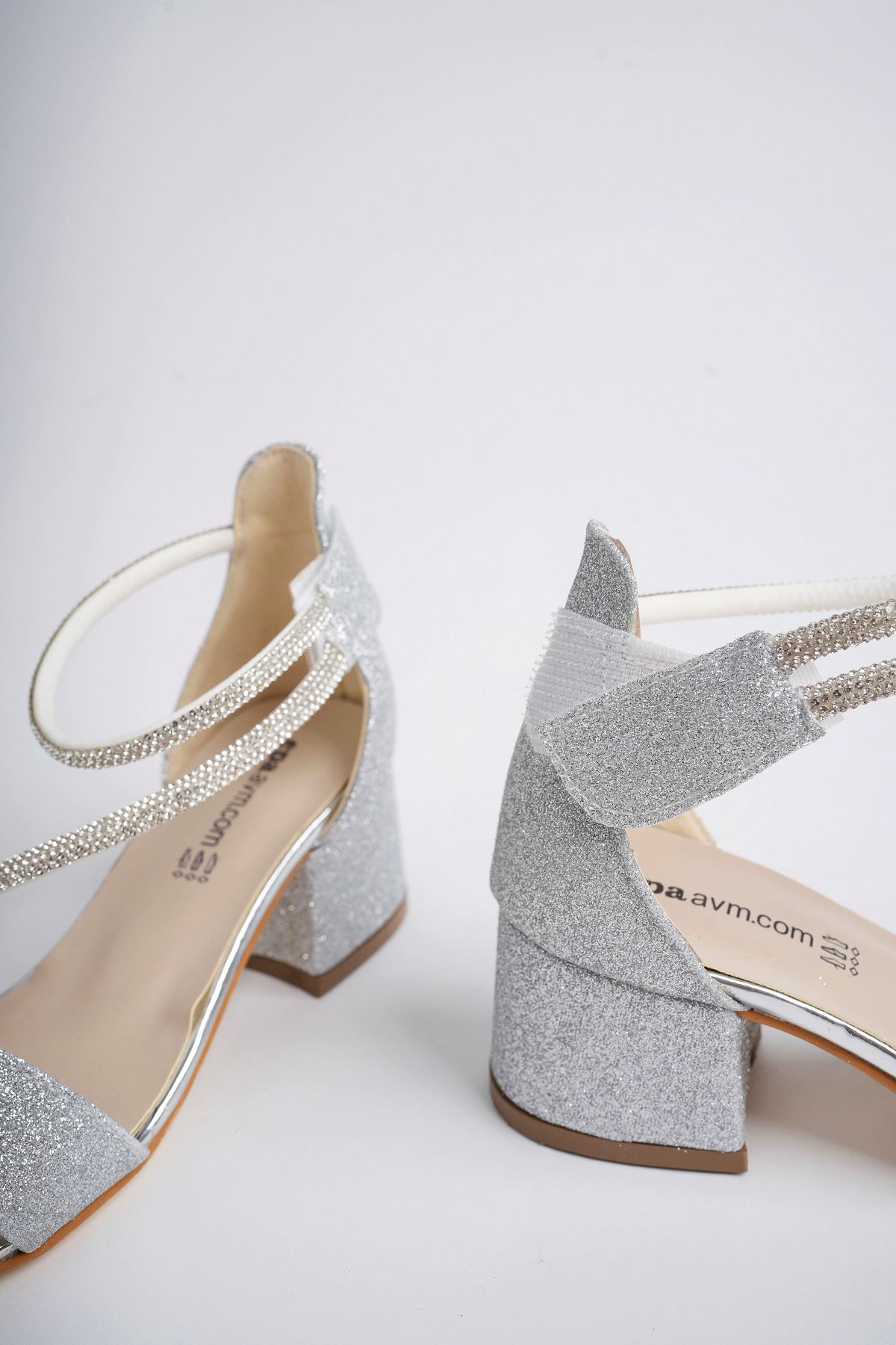 Topuklu Biyesi Taşlı Gümüş Kız Çocuk Ayakkabı