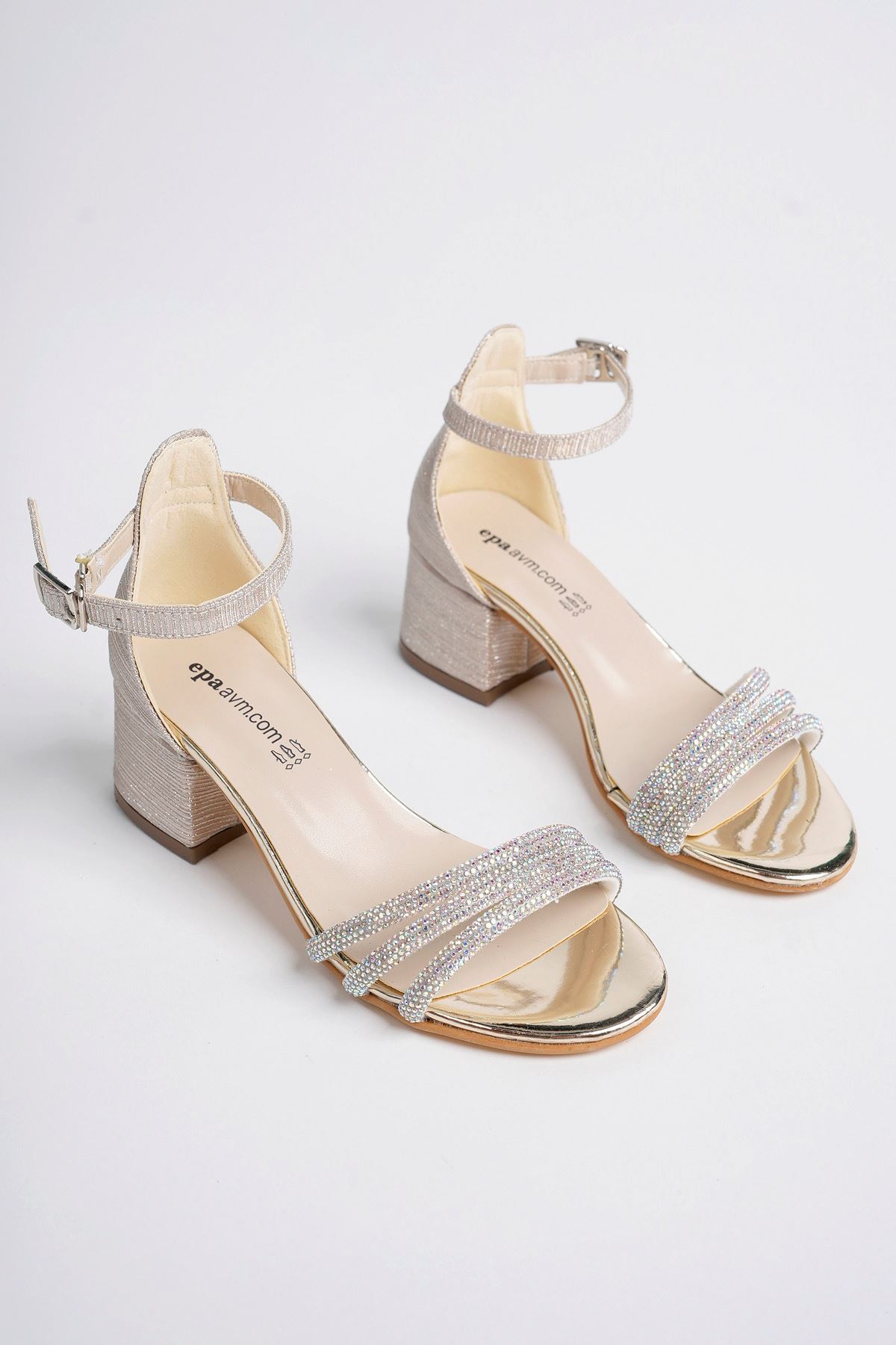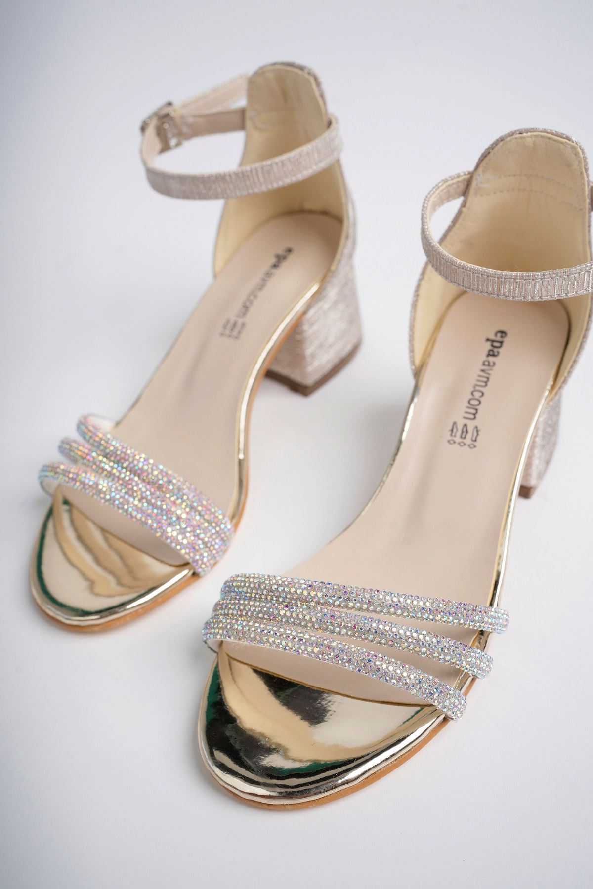 Topuklu Üç Bant Taşlı Altın Kız Çocuk Ayakkabı