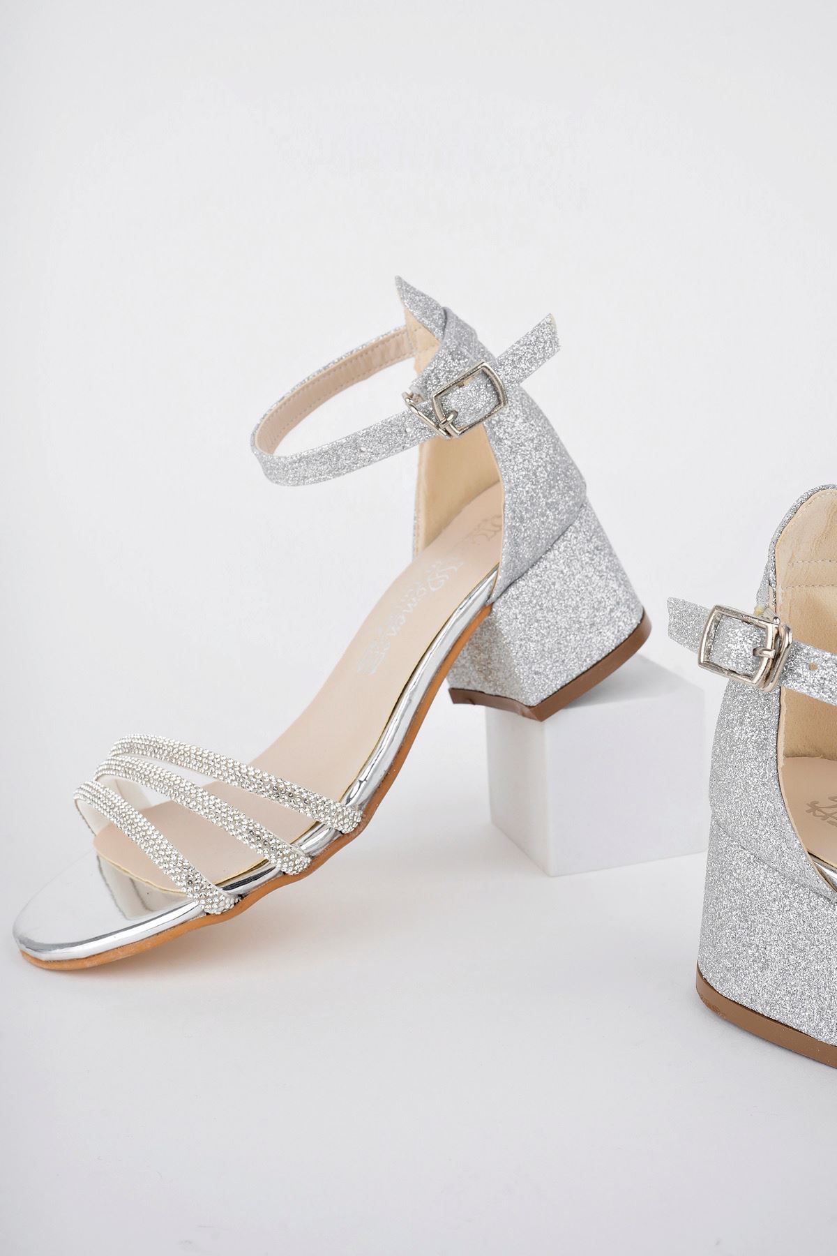 Topuklu Üç Bant Taşlı Gümüş Kız Çocuk Ayakkabı