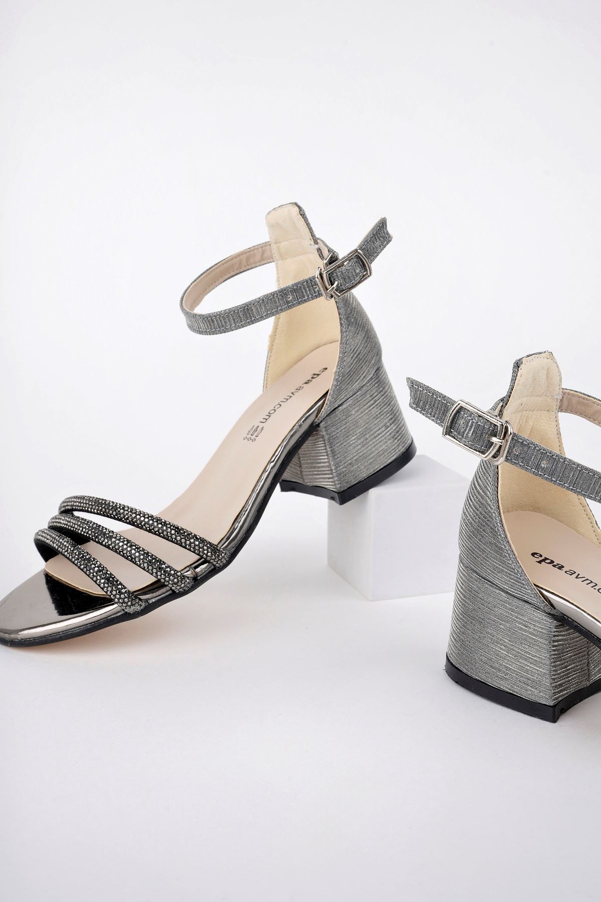 Topuklu Üç Bant Taşlı Platin Kız Çocuk Ayakkabı