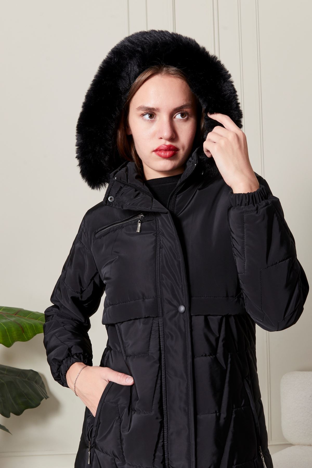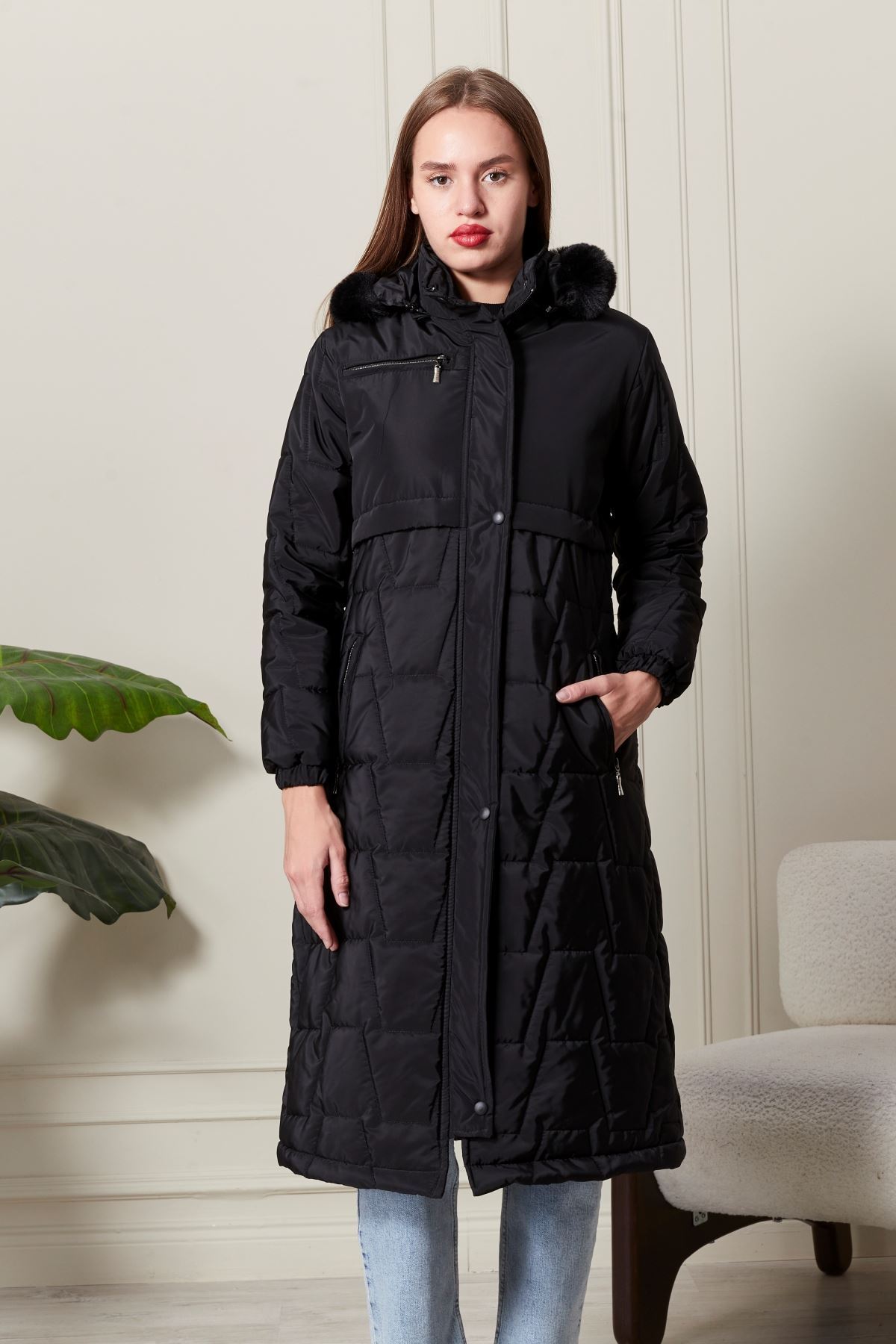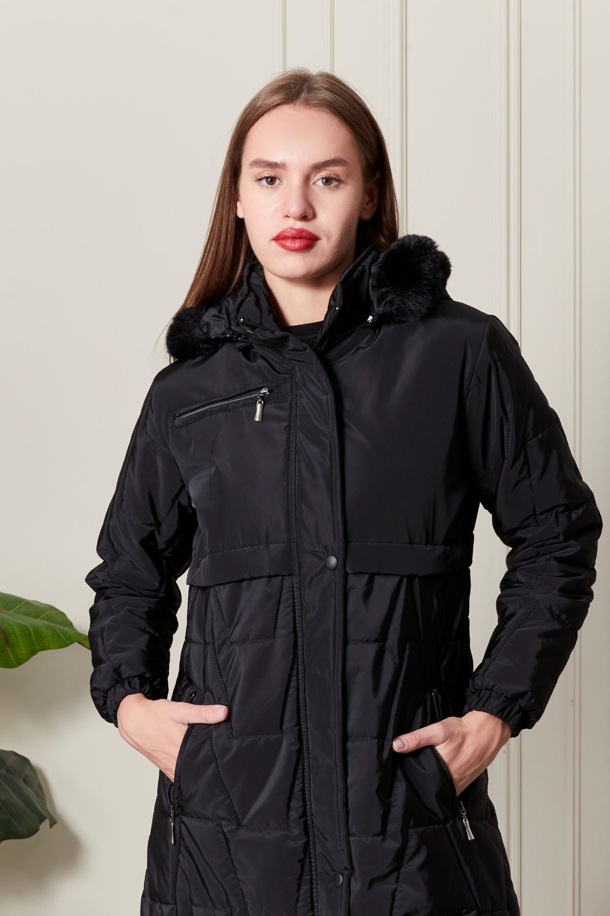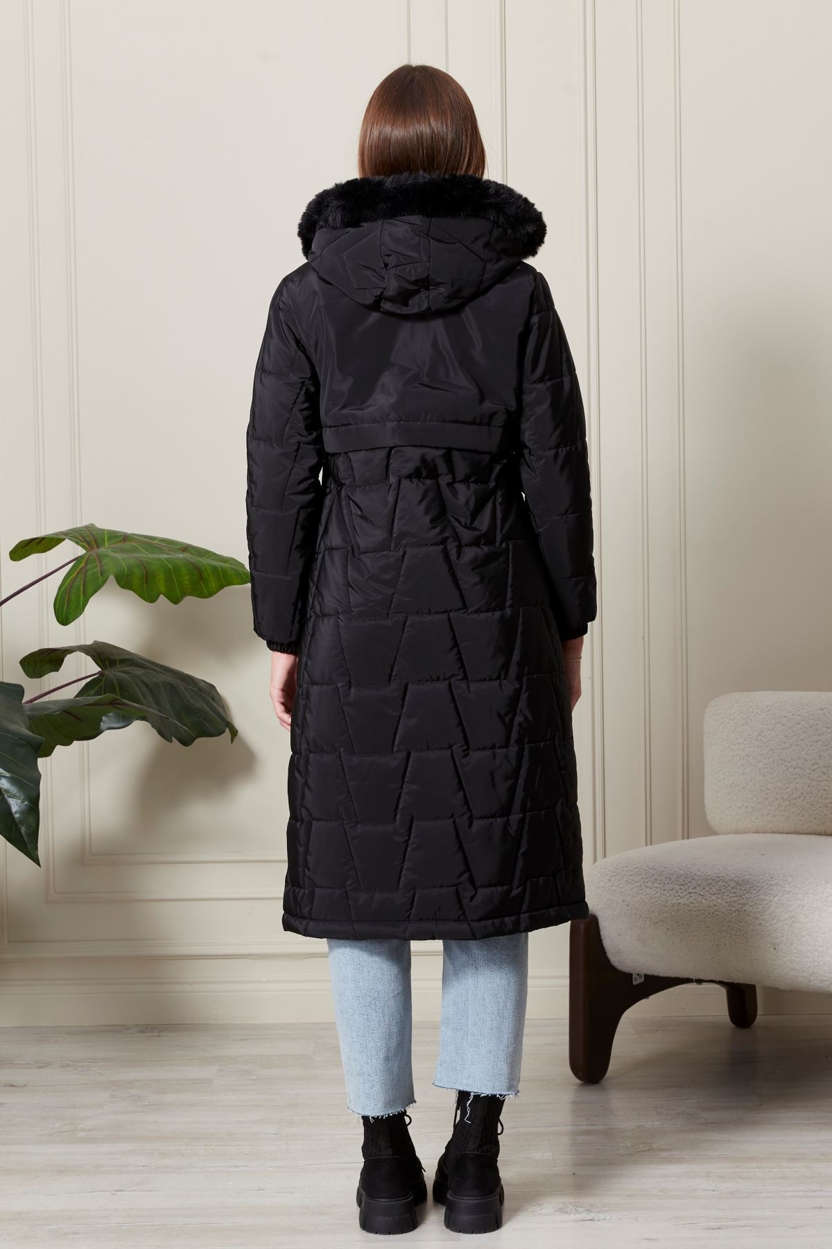 Uzun Kapitone Siyah Kadın Kaban