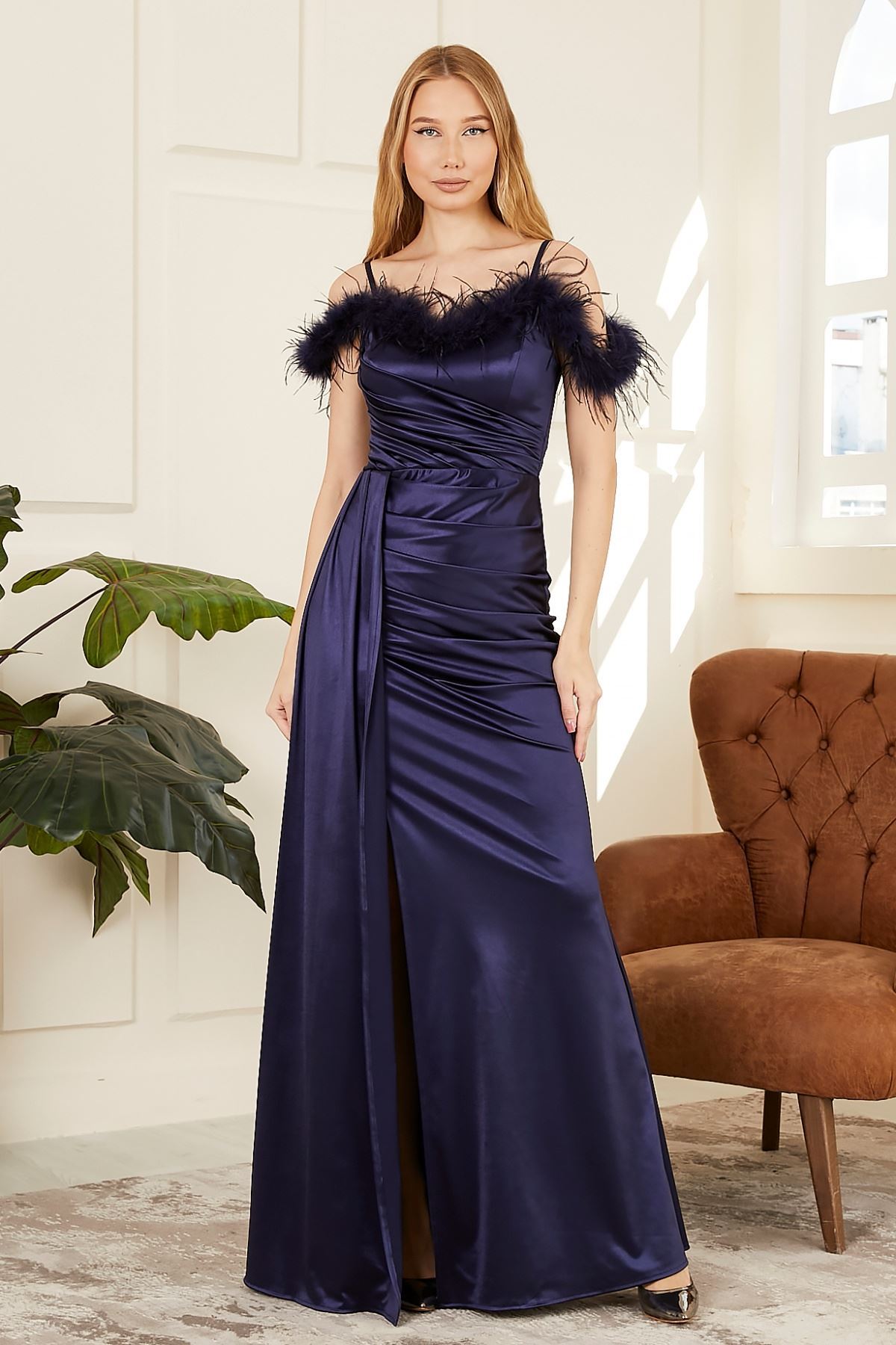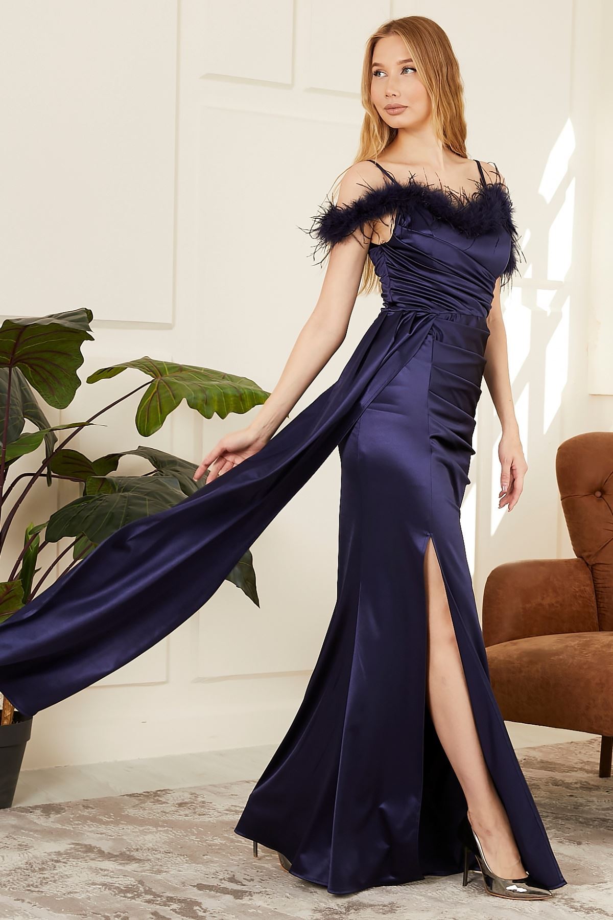 Yırtmaçlı Üstü Tüylü Kadın Abiye Elbise